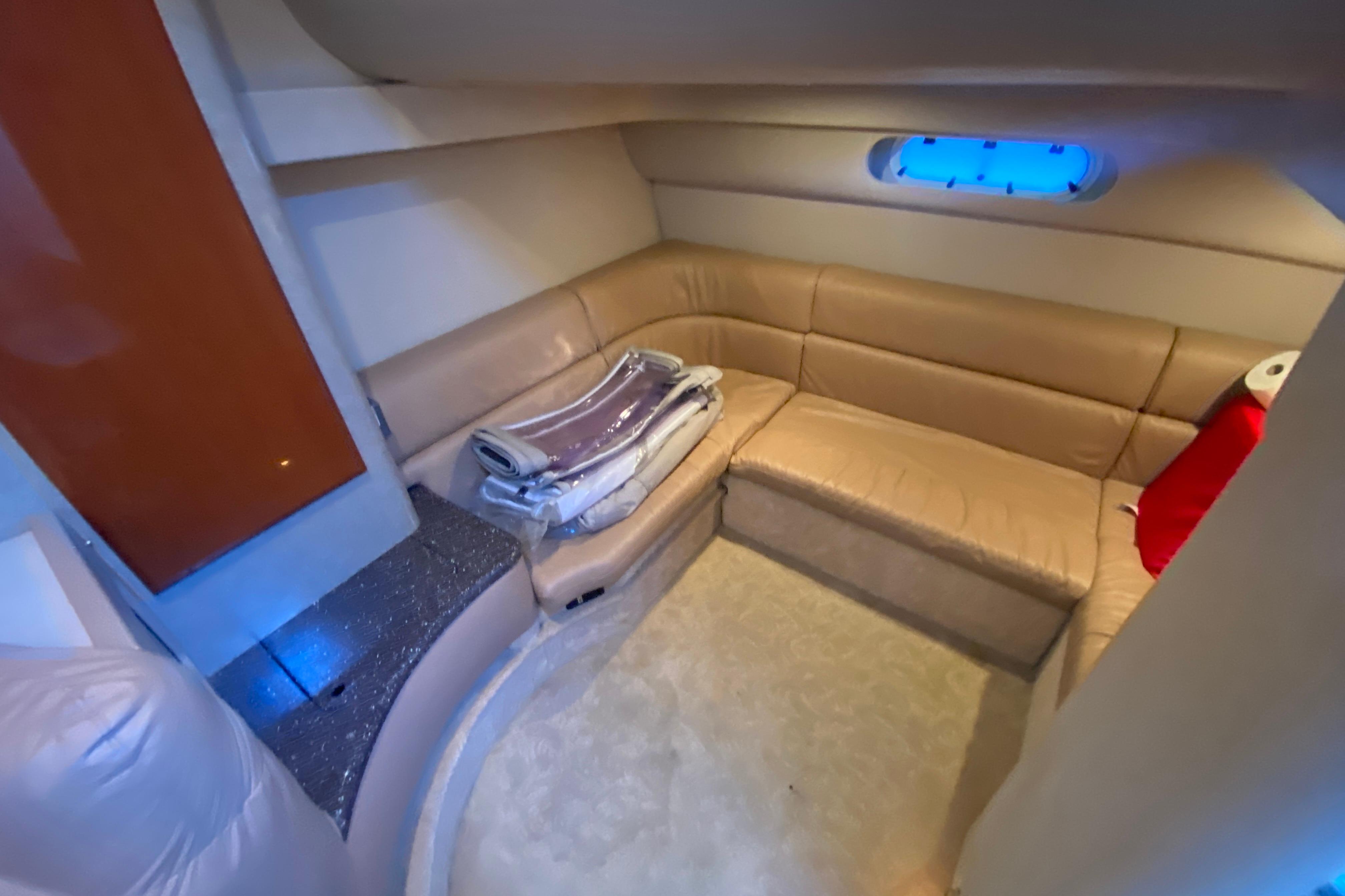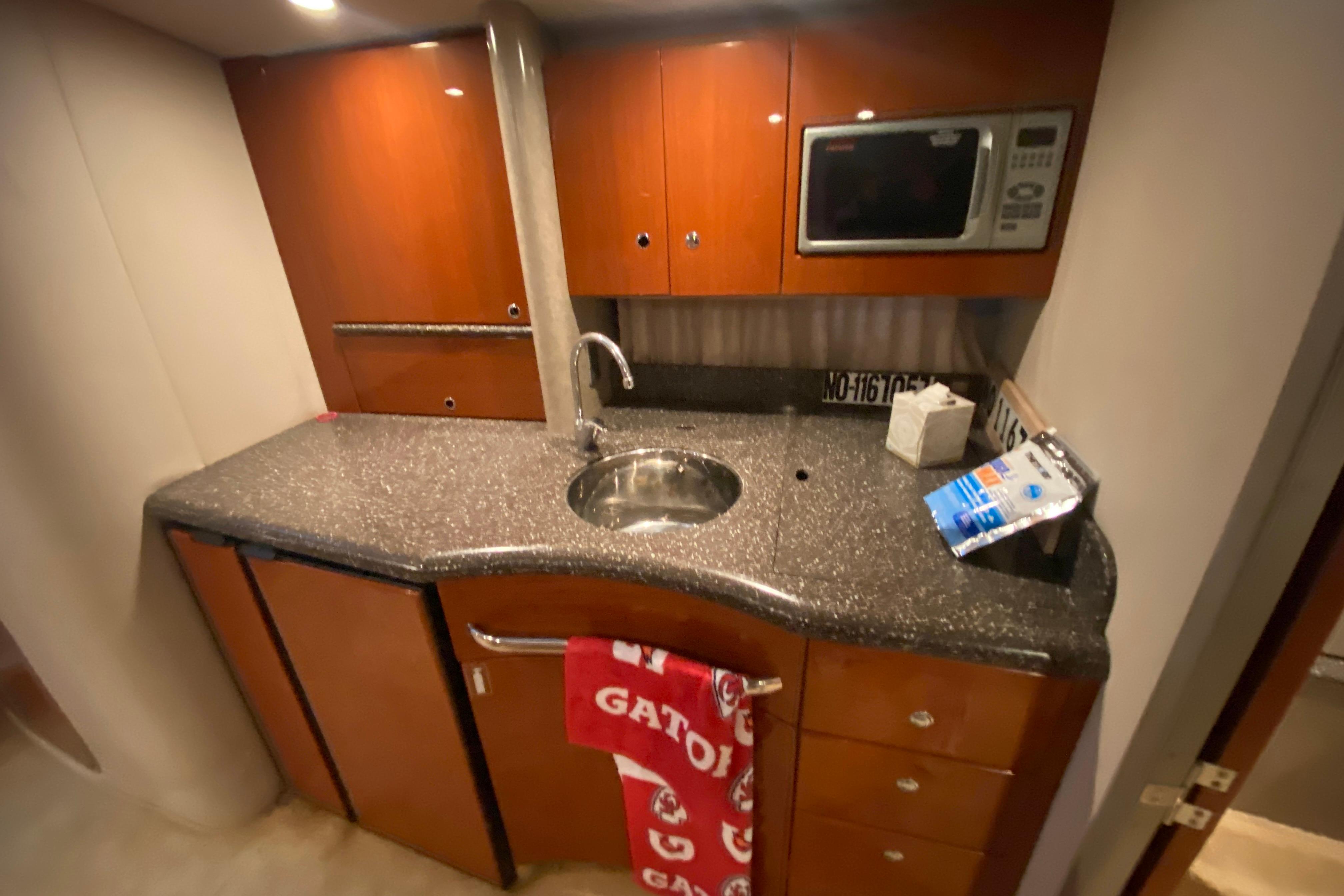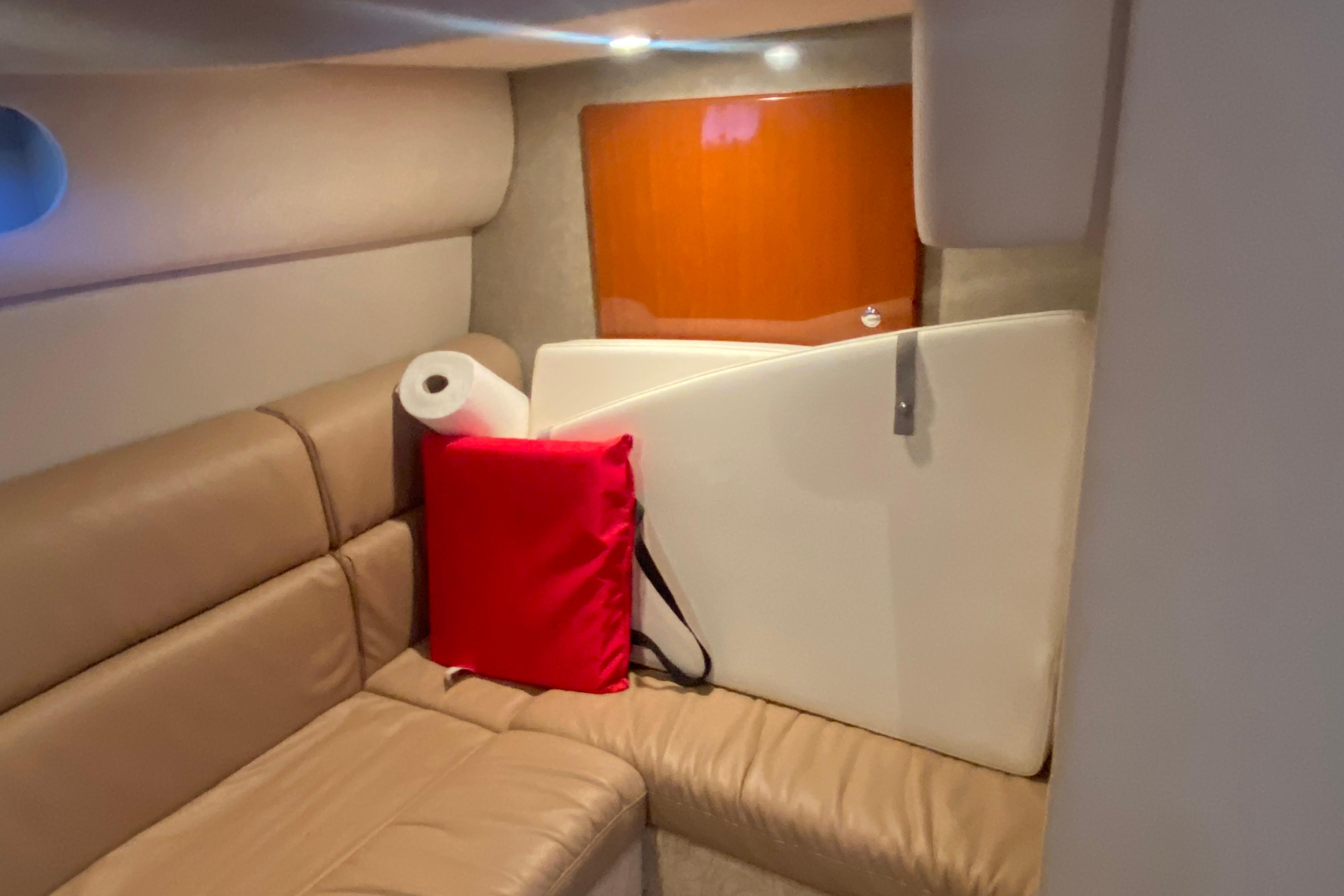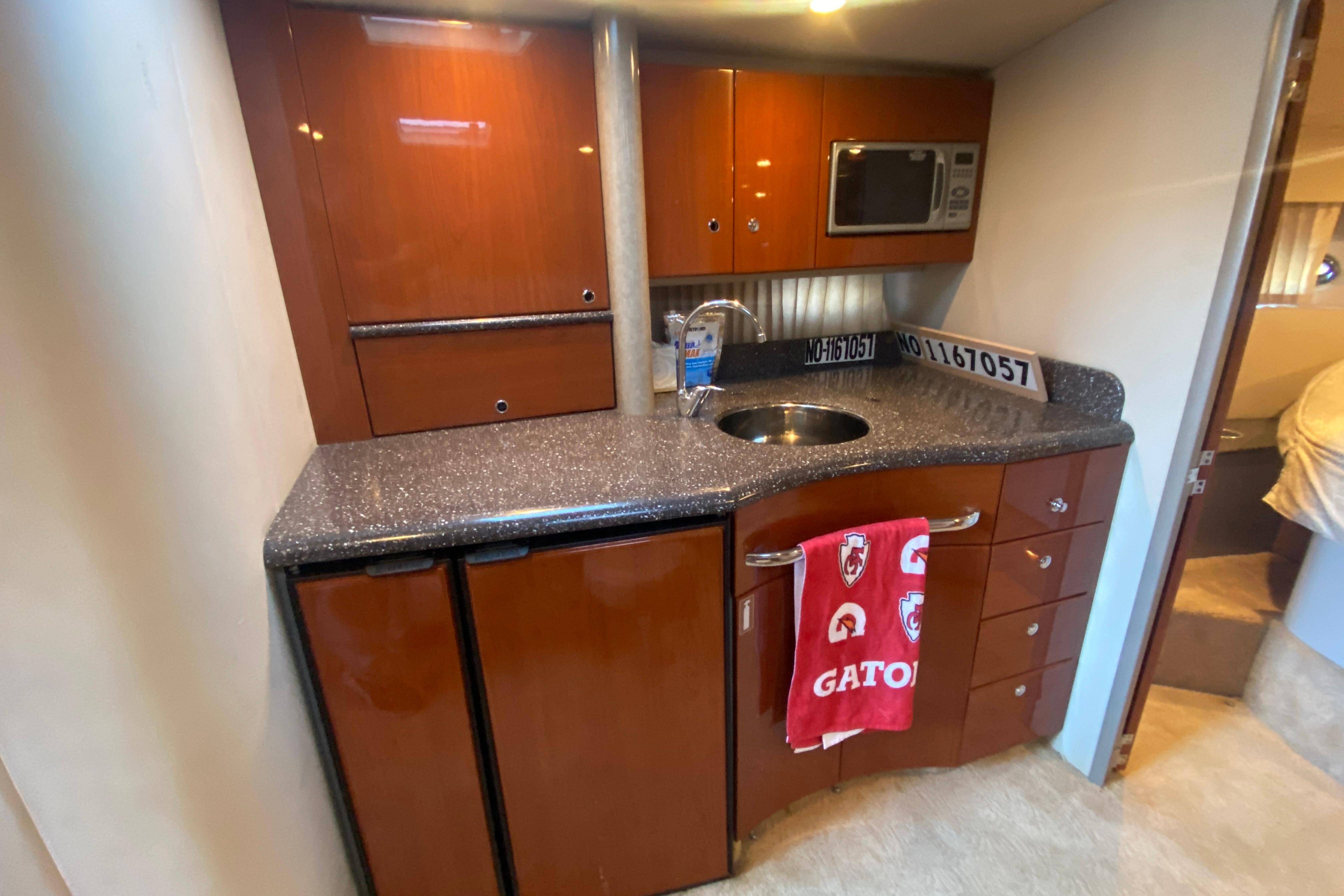 A pair of 440 hp Yanmar 6LP2A push her comfortably in the mid 20’s. Soak in the views at the double wide companion chair at the helm with an impressive wood grain dash with gauges and engine controls. Great visibility is not the only thing that makes your new vessel easy to run; a bow thruster makes docking almost effortless. The Hydraulic swim platform comes in handy when you want to put your chairs there and dip your feet in the water. Also provides an area for your PWC if you wish.