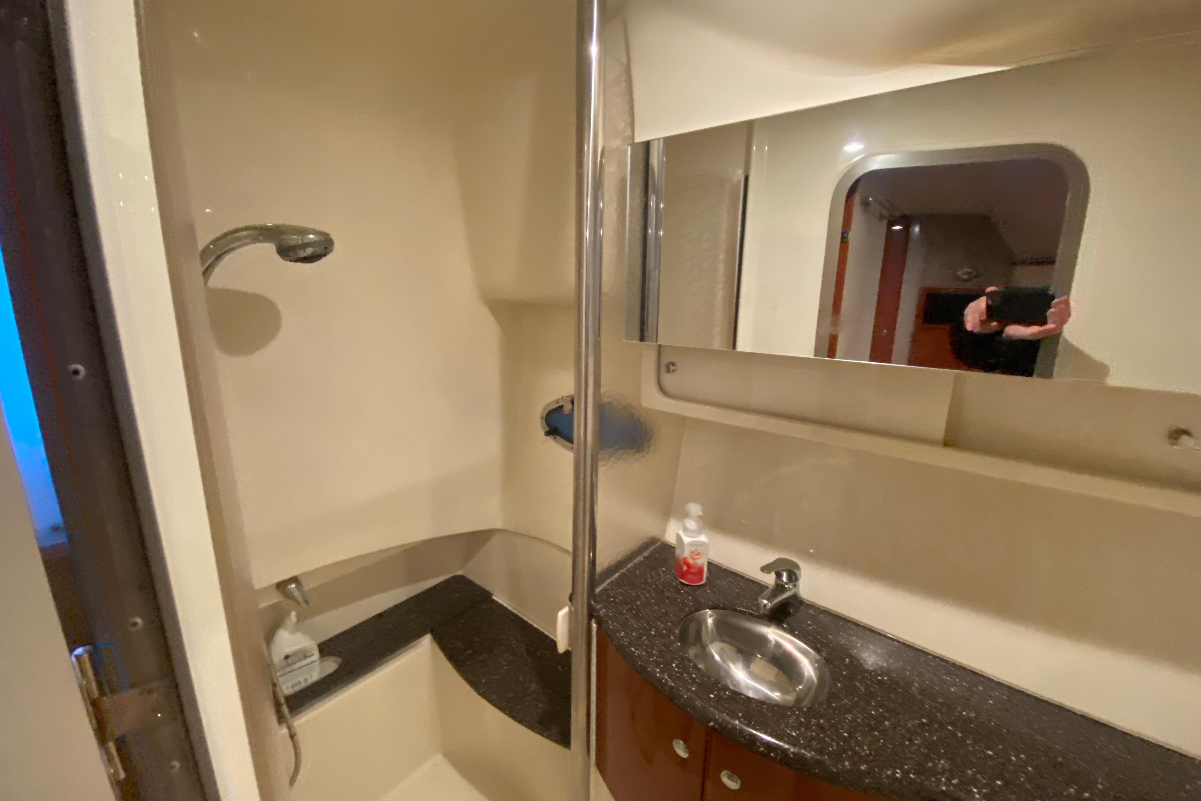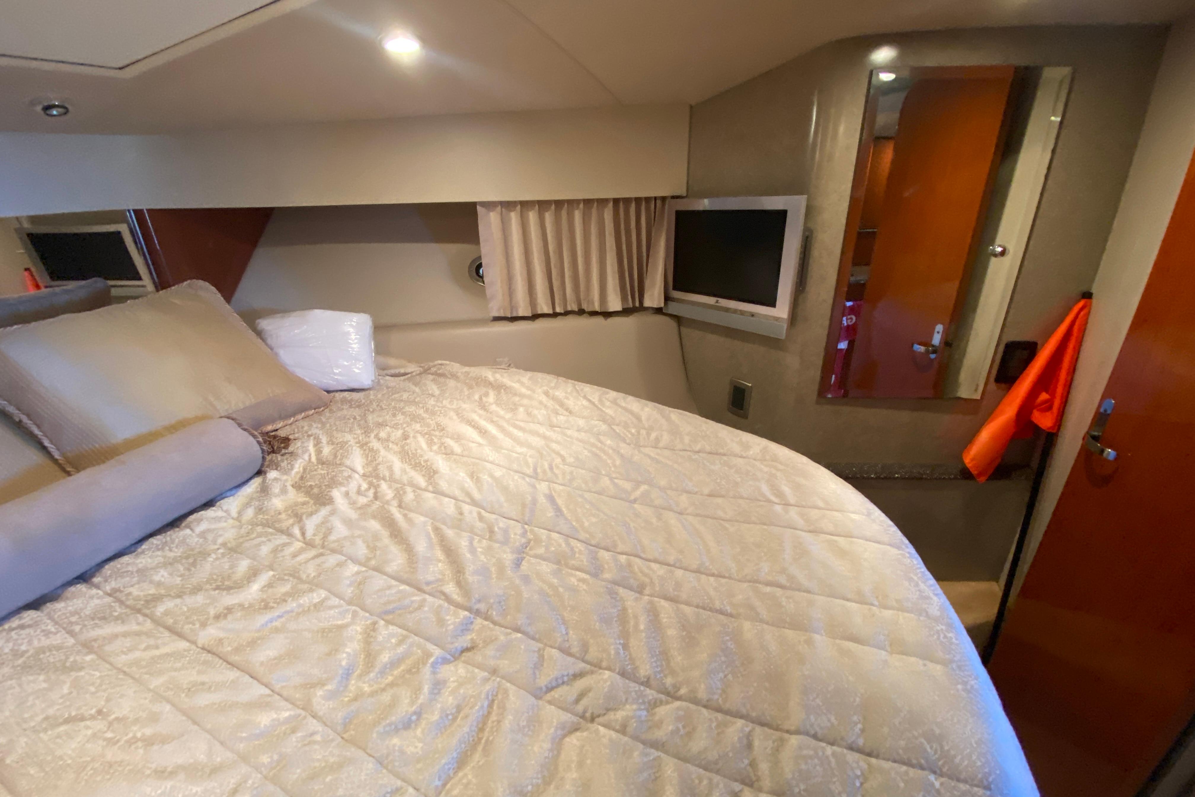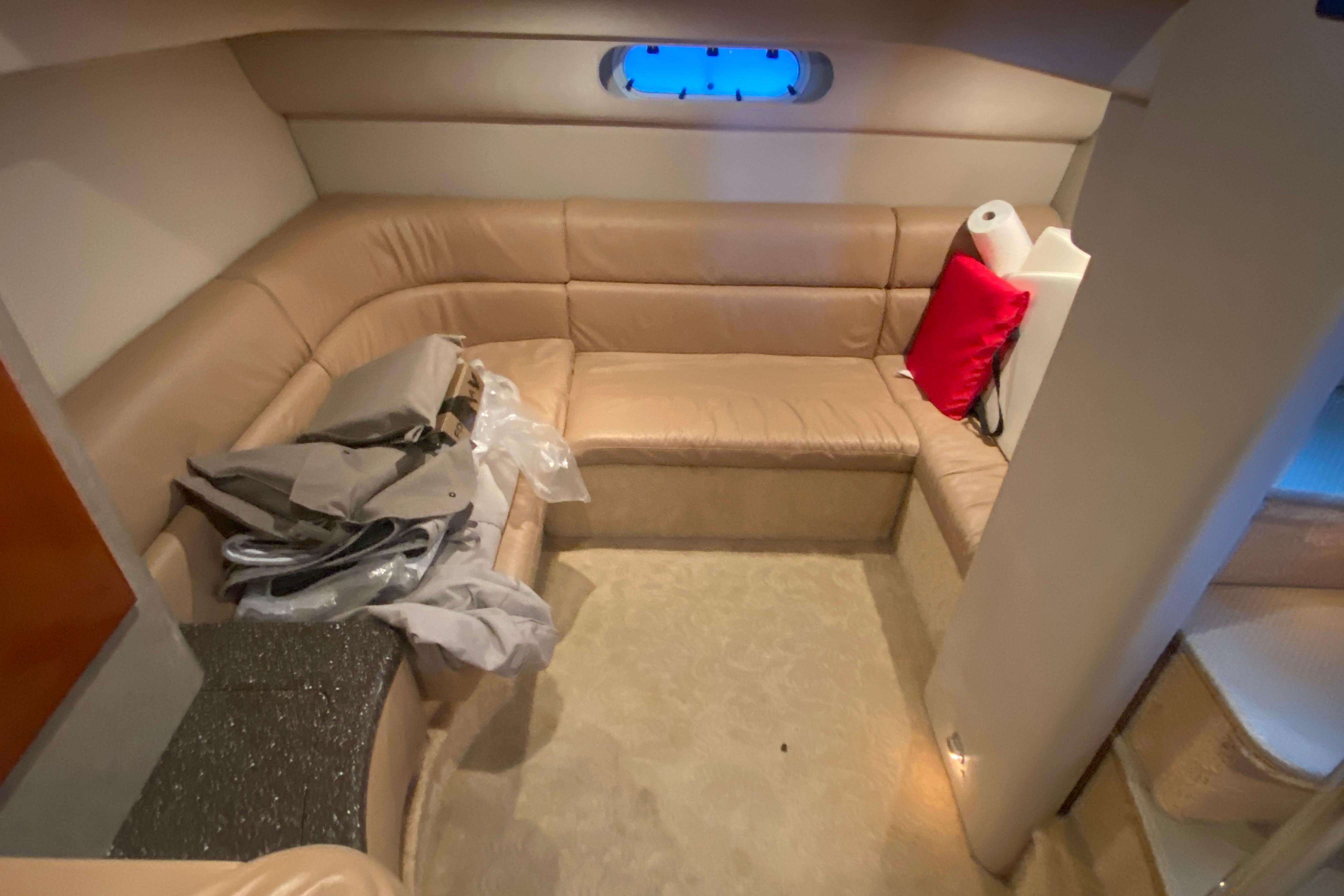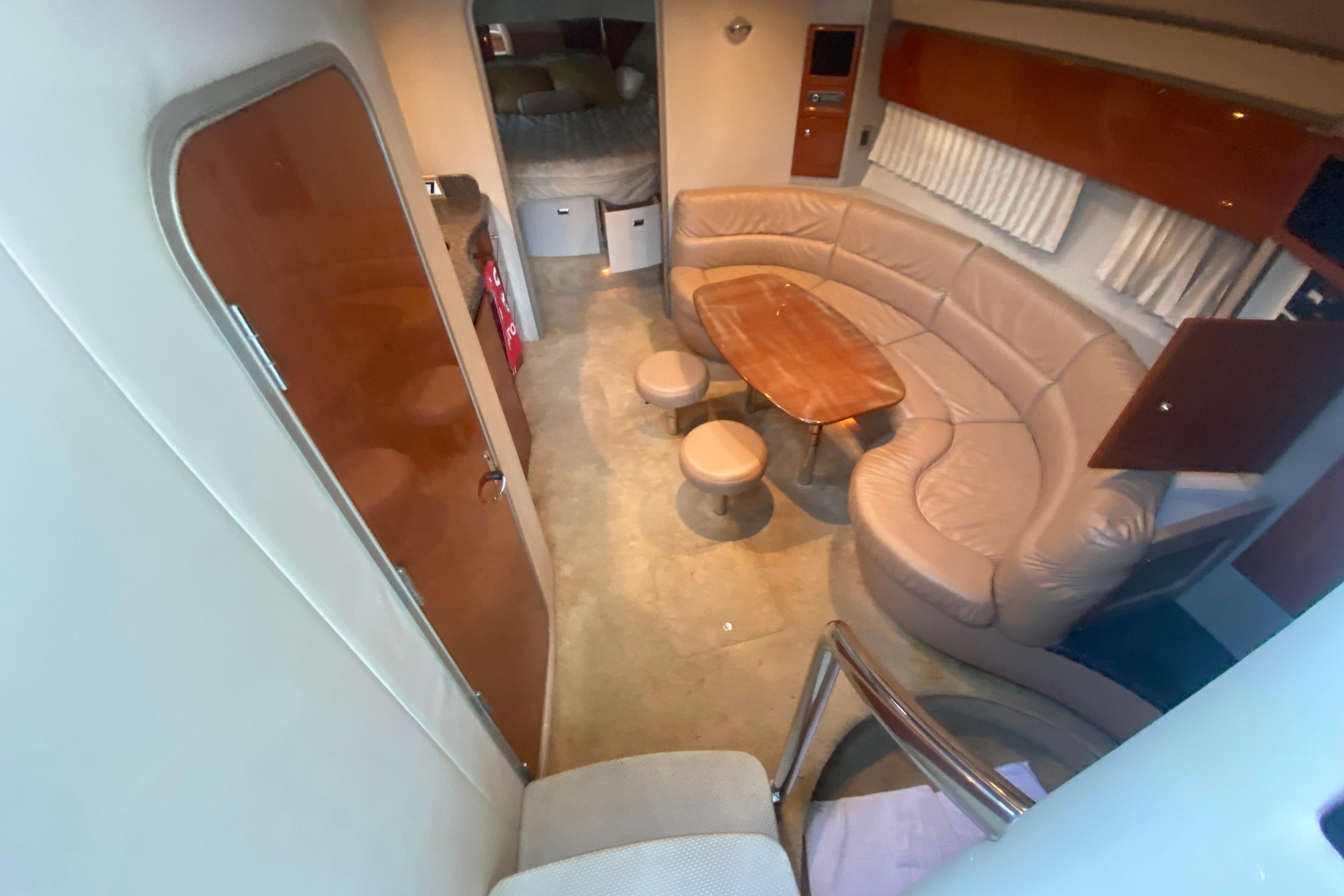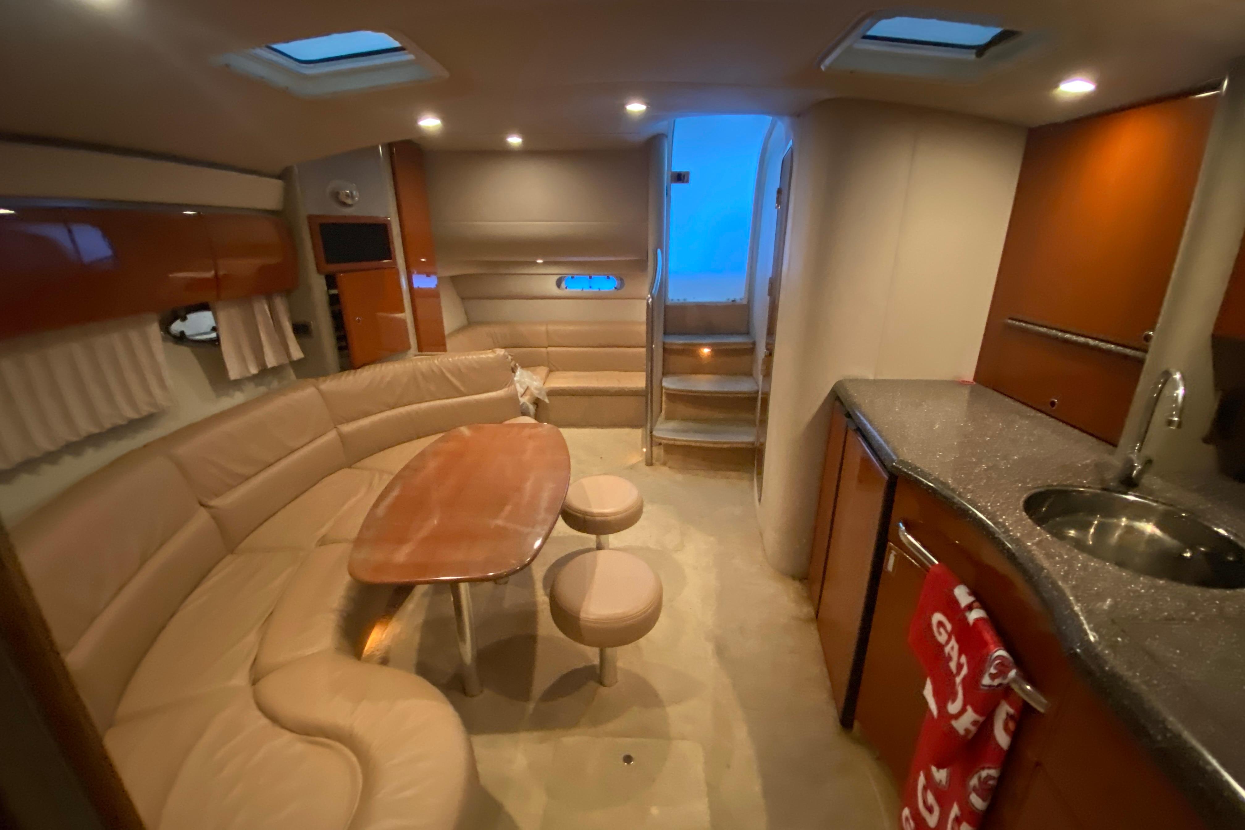 A pair of 440 hp Yanmar 6LP2A push her comfortably in the mid 20’s. Soak in the views at the double wide companion chair at the helm with an impressive wood grain dash with gauges and engine controls. Great visibility is not the only thing that makes your new vessel easy to run; a bow thruster makes docking almost effortless. The Hydraulic swim platform comes in handy when you want to put your chairs there and dip your feet in the water. Also provides an area for your PWC if you wish.