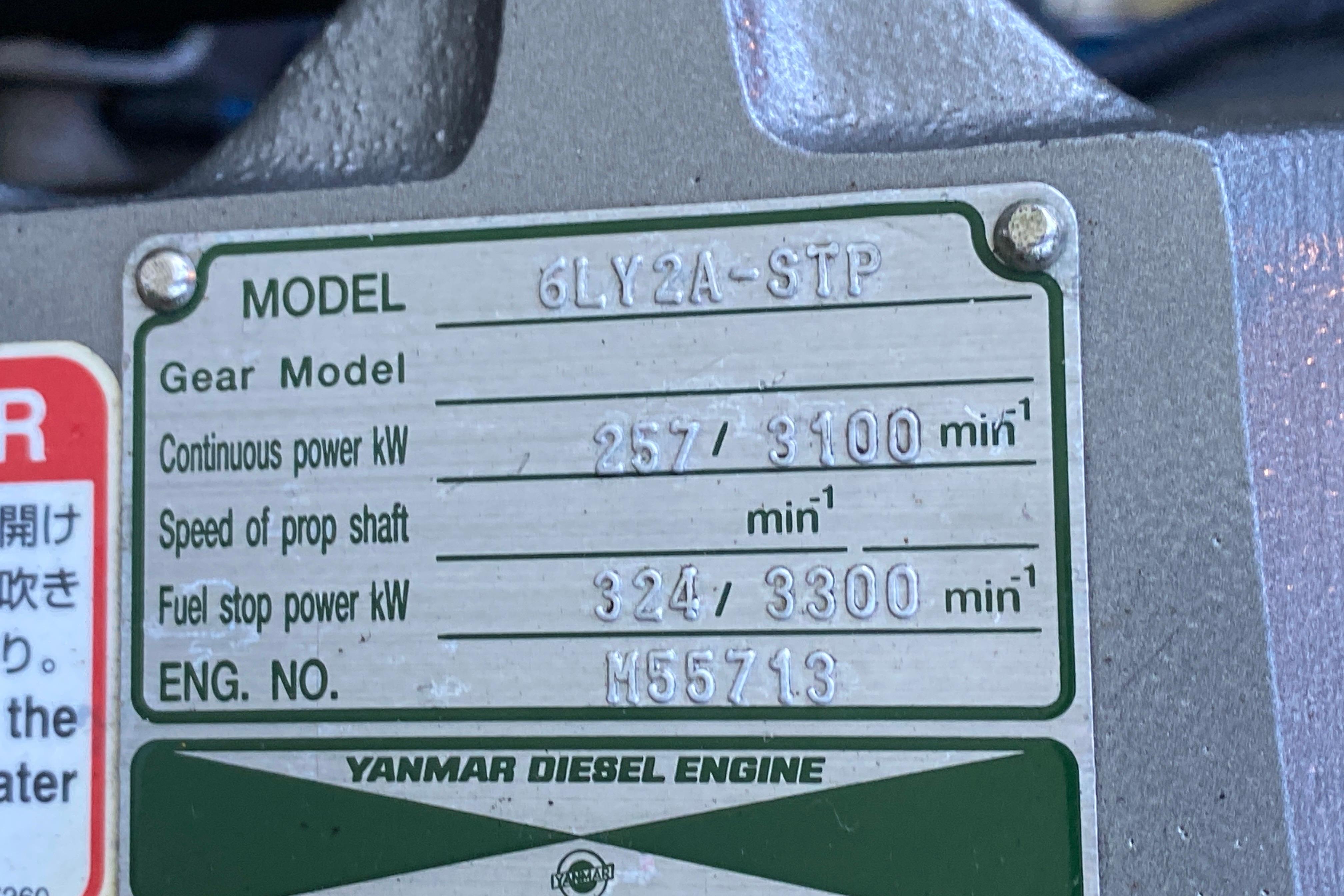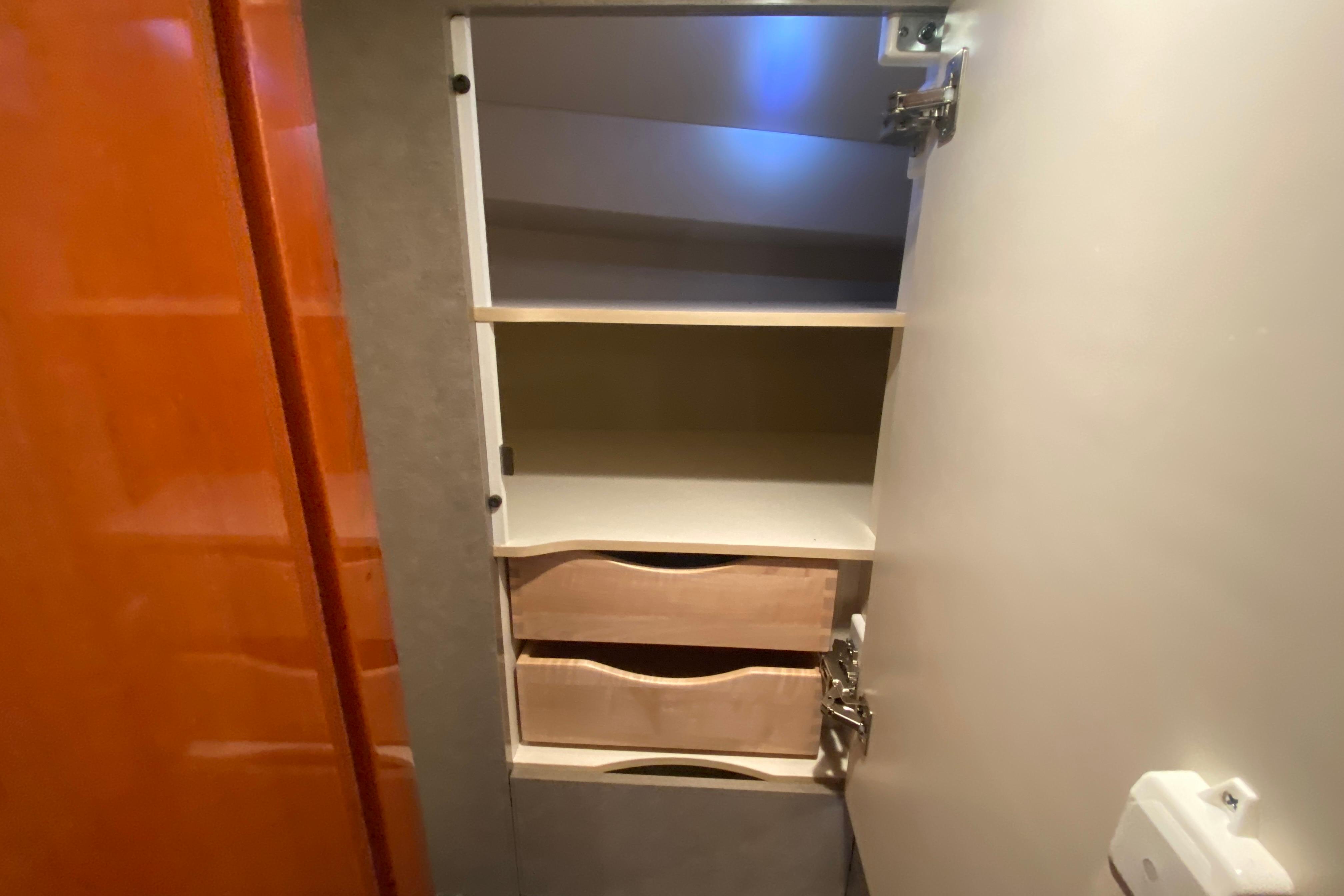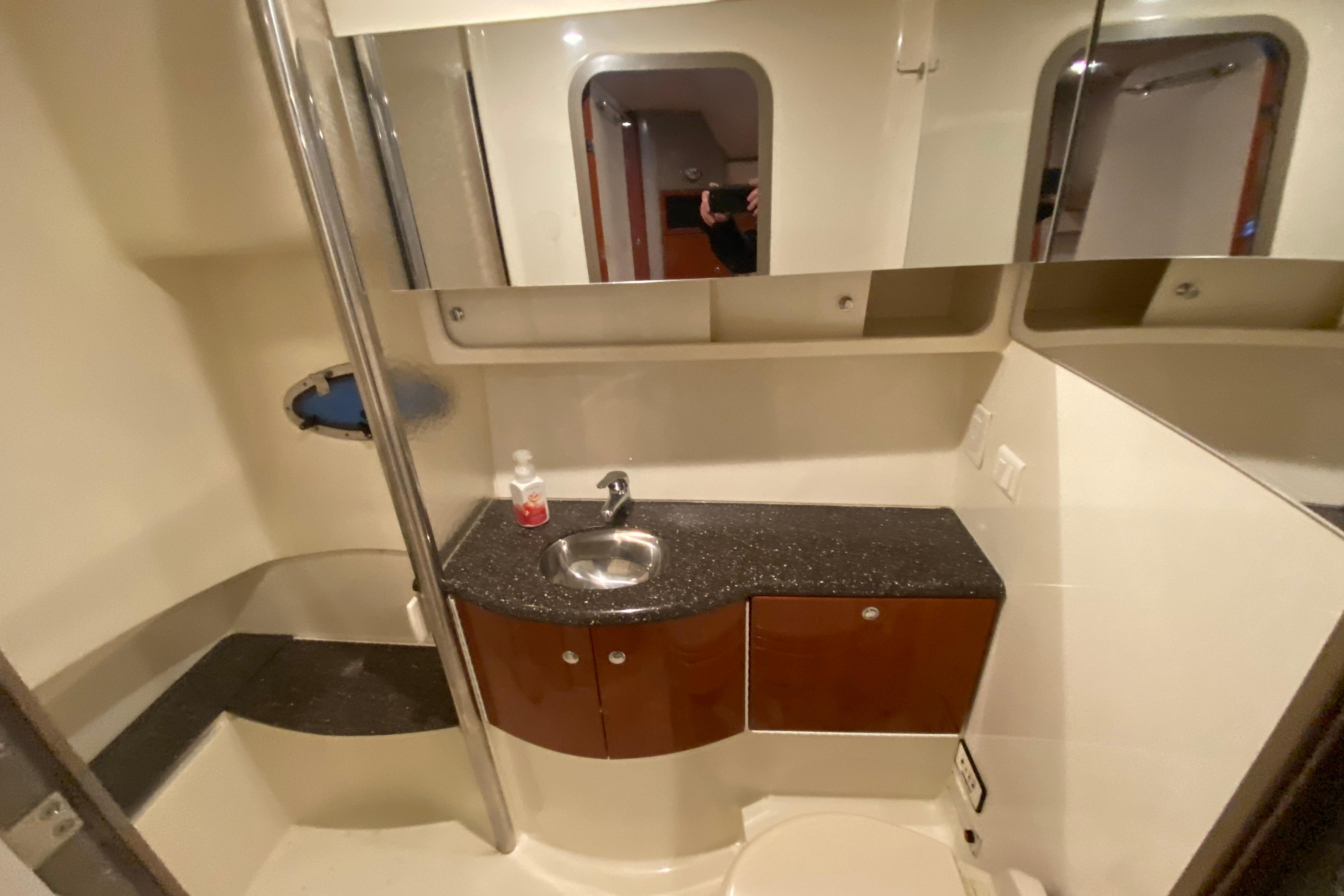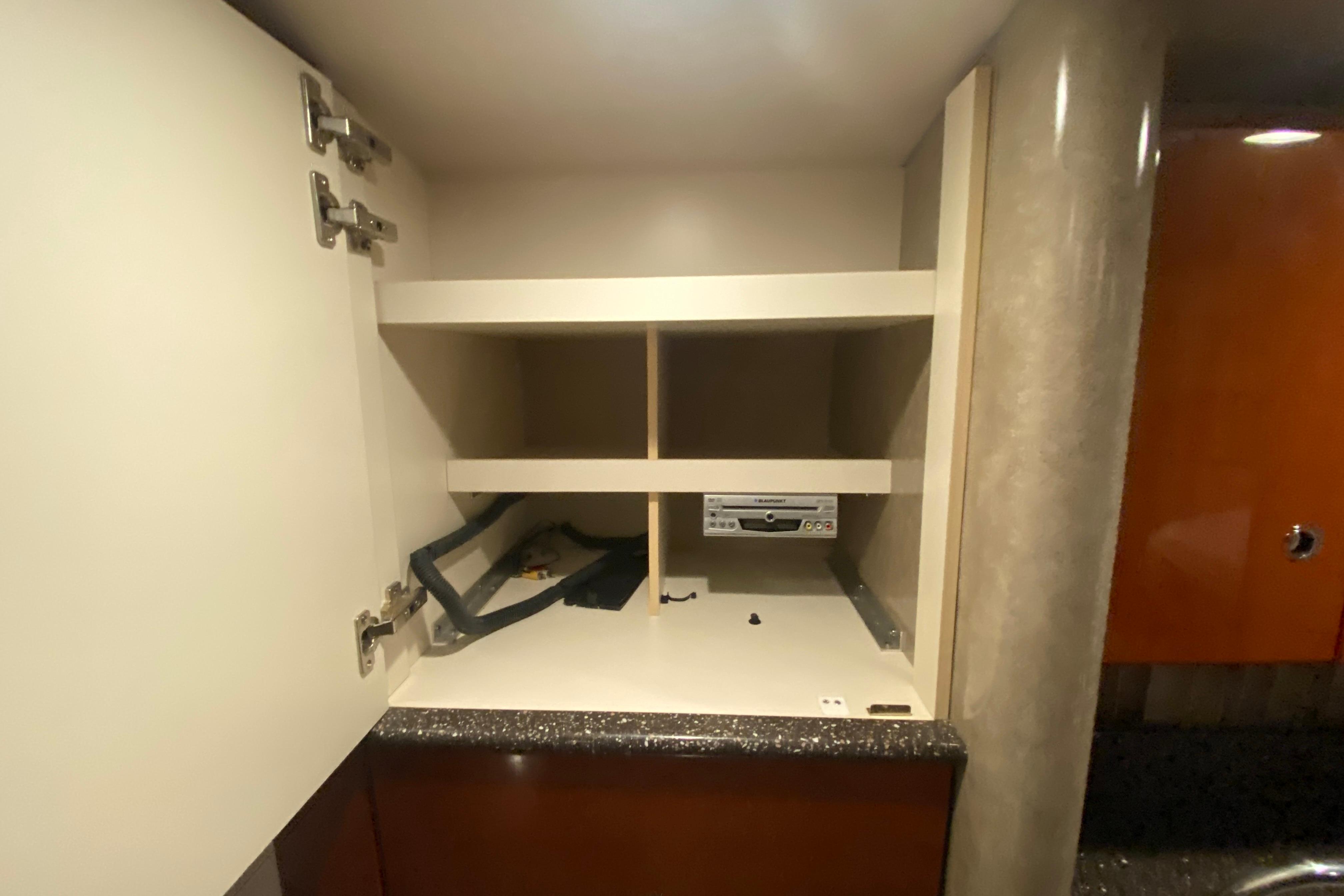 A pair of 440 hp Yanmar 6LP2A push her comfortably in the mid 20’s. Soak in the views at the double wide companion chair at the helm with an impressive wood grain dash with gauges and engine controls. Great visibility is not the only thing that makes your new vessel easy to run; a bow thruster makes docking almost effortless. The Hydraulic swim platform comes in handy when you want to put your chairs there and dip your feet in the water. Also provides an area for your PWC if you wish.