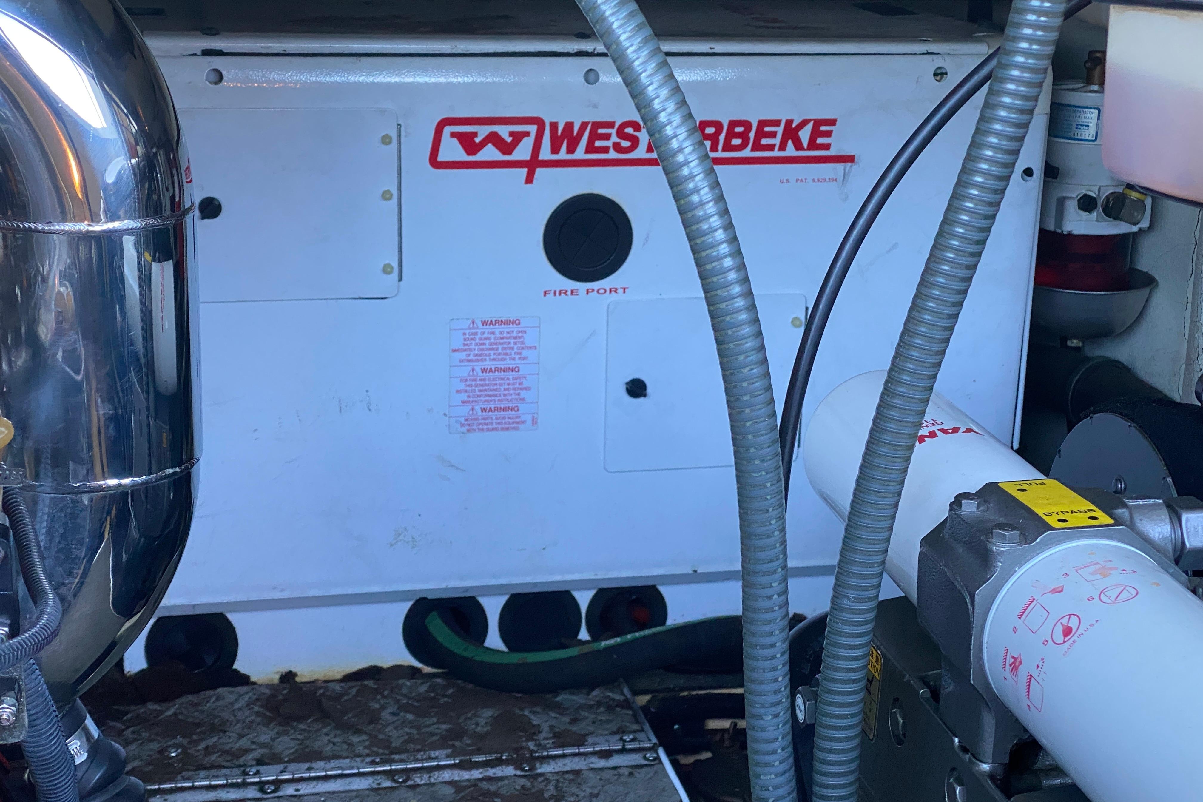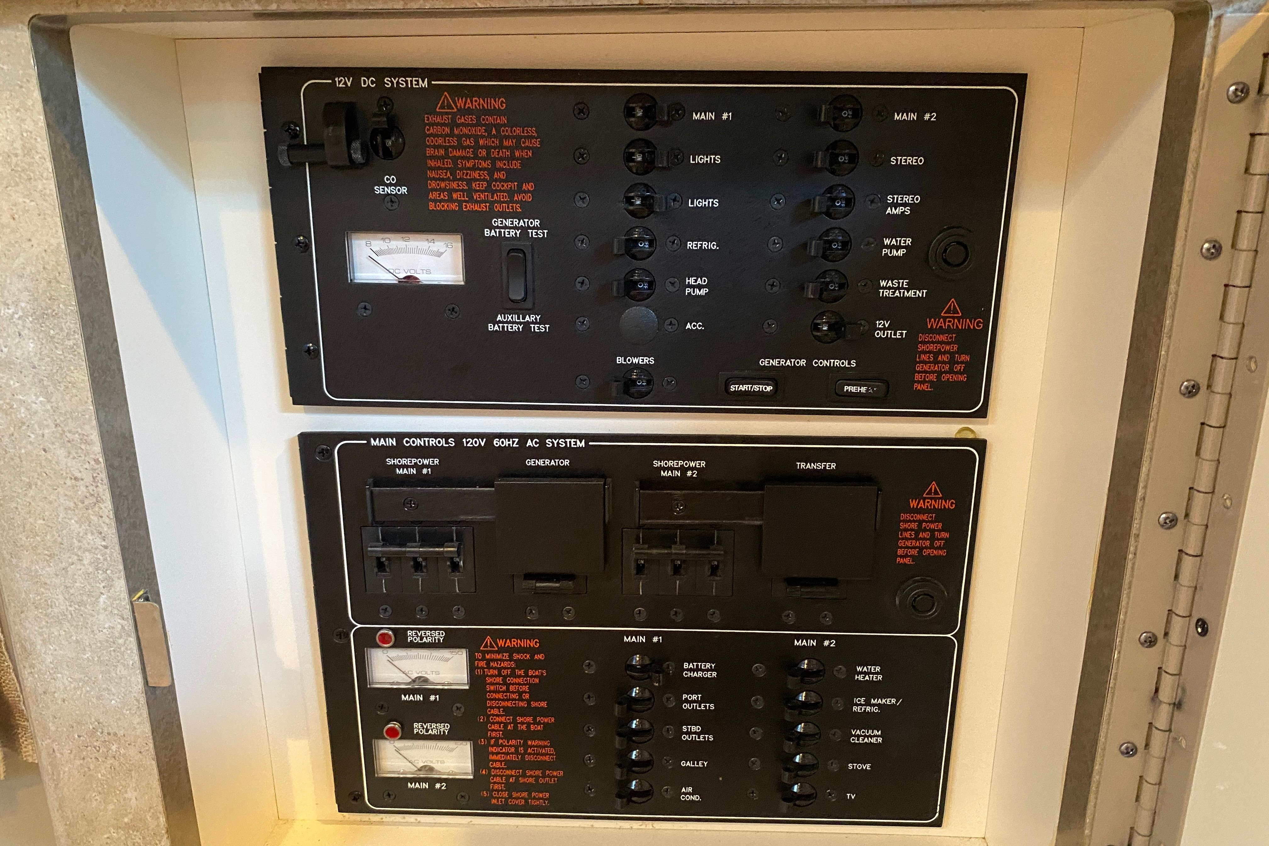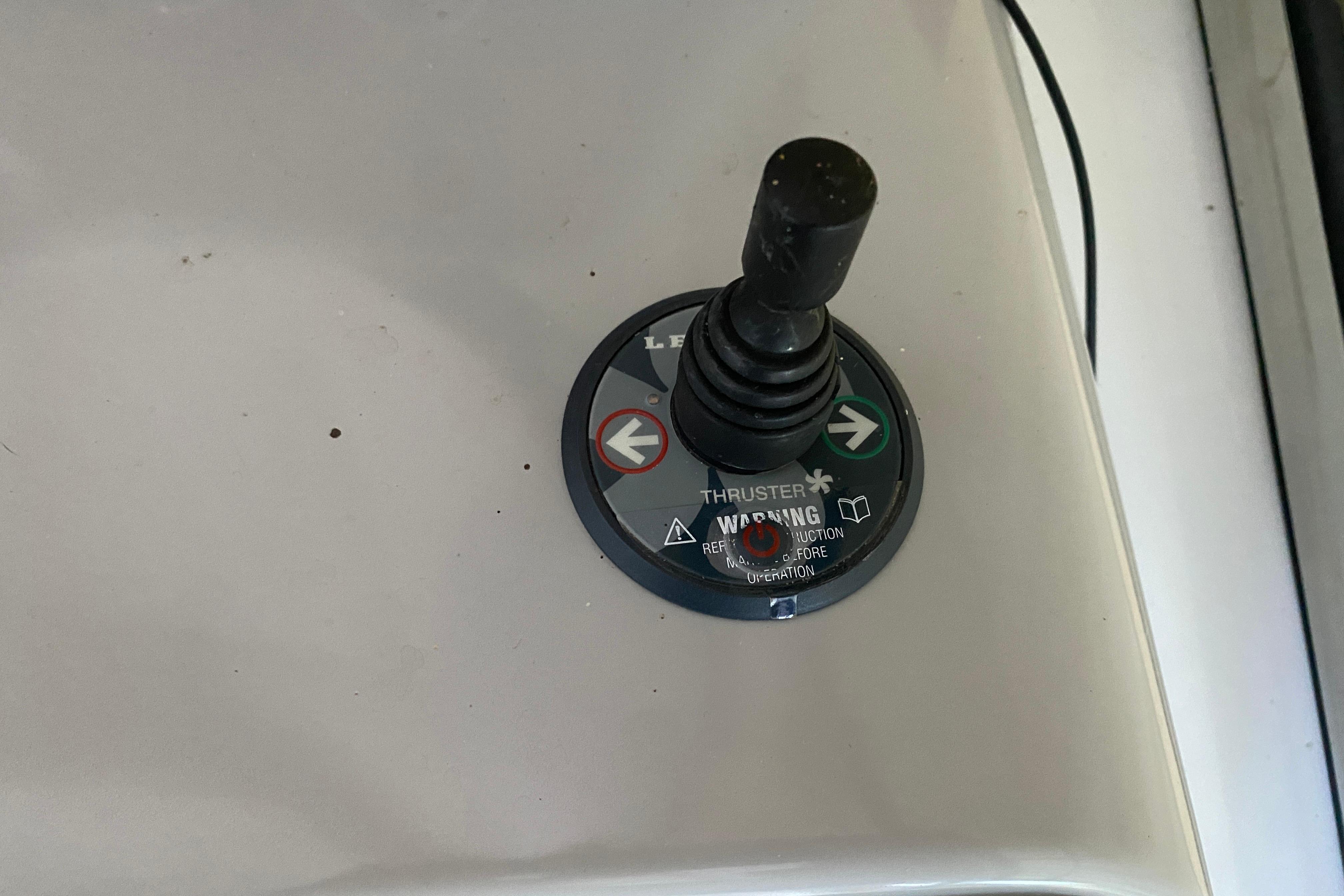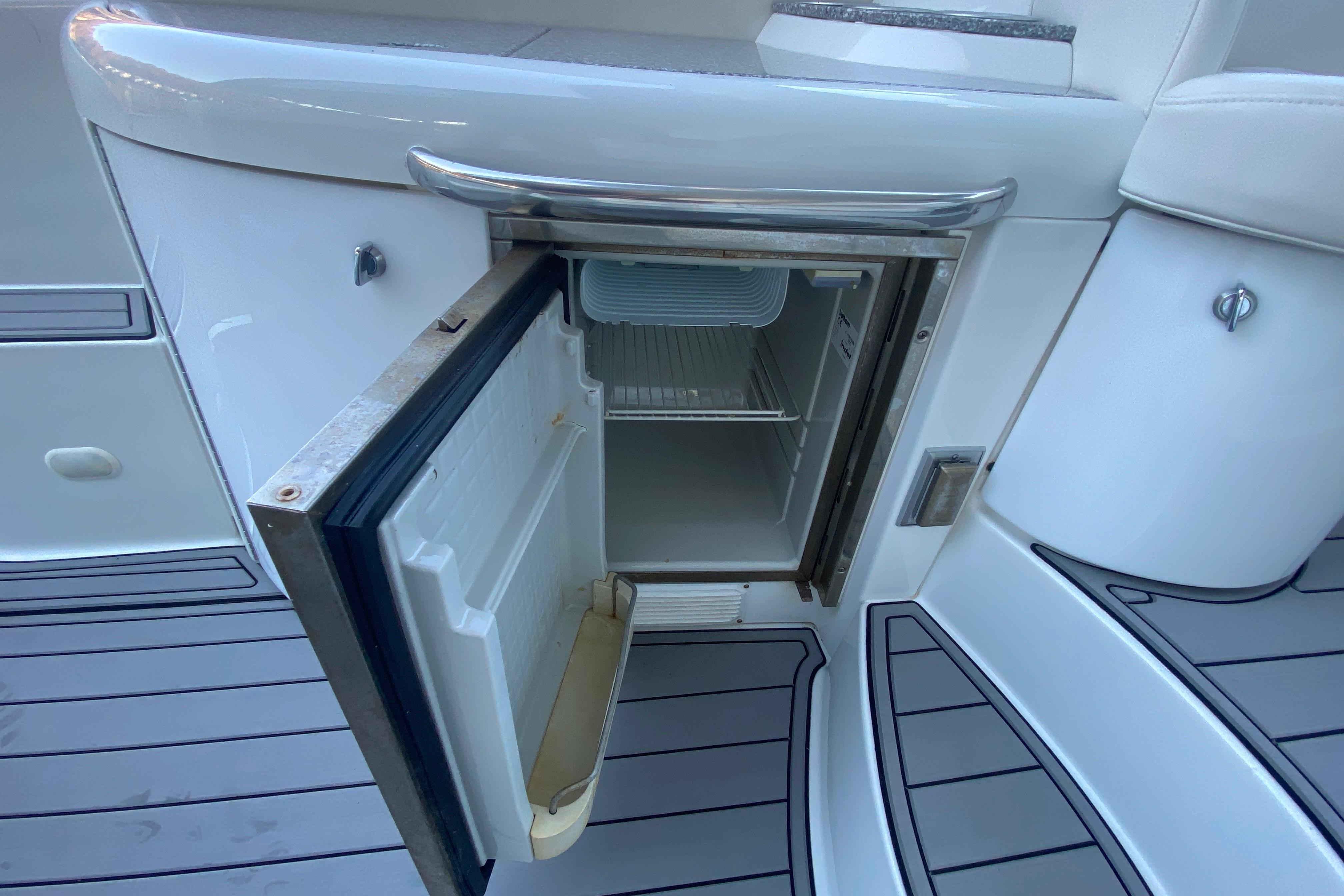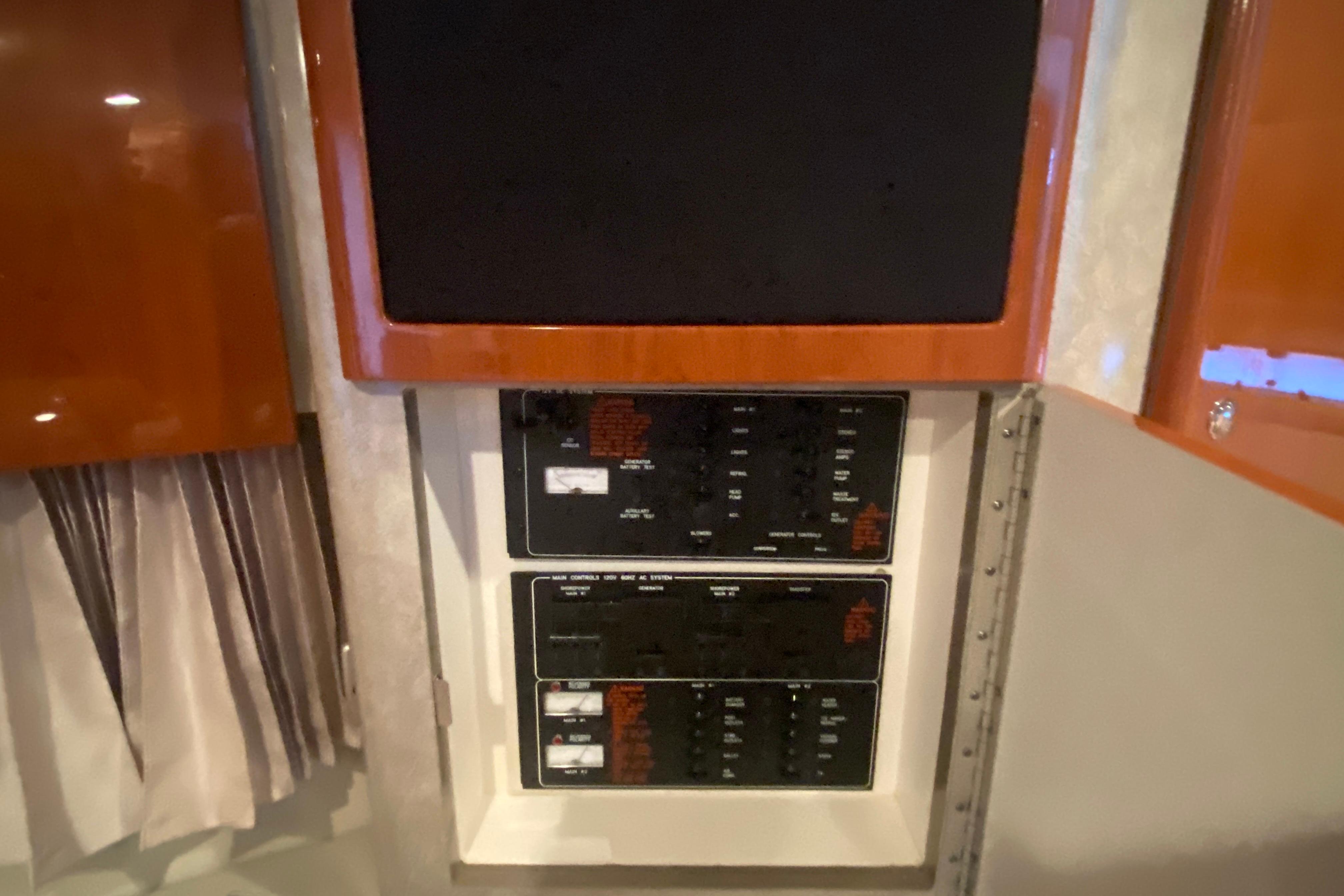 A pair of 440 hp Yanmar 6LP2A push her comfortably in the mid 20’s. Soak in the views at the double wide companion chair at the helm with an impressive wood grain dash with gauges and engine controls. Great visibility is not the only thing that makes your new vessel easy to run; a bow thruster makes docking almost effortless. The Hydraulic swim platform comes in handy when you want to put your chairs there and dip your feet in the water. Also provides an area for your PWC if you wish.