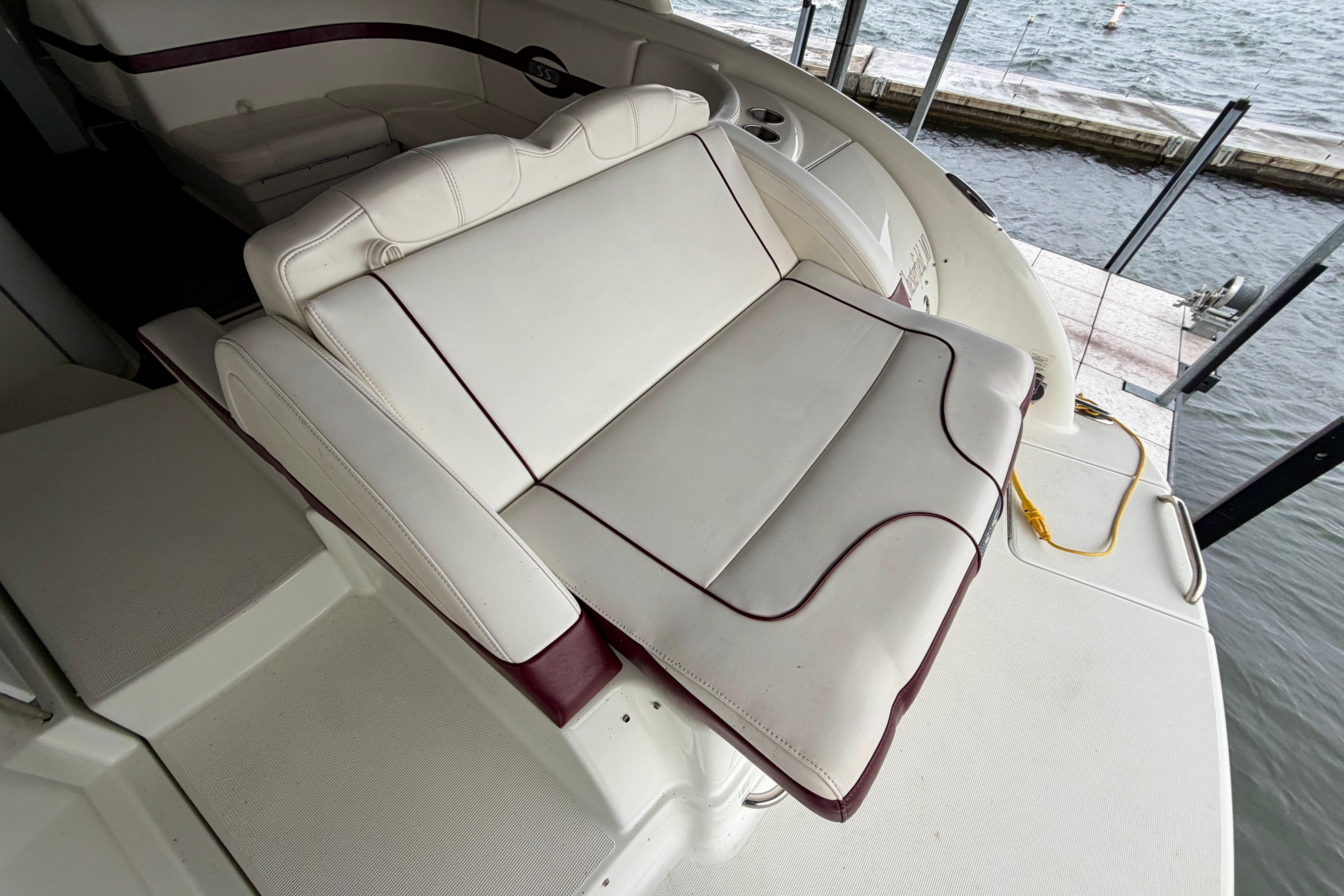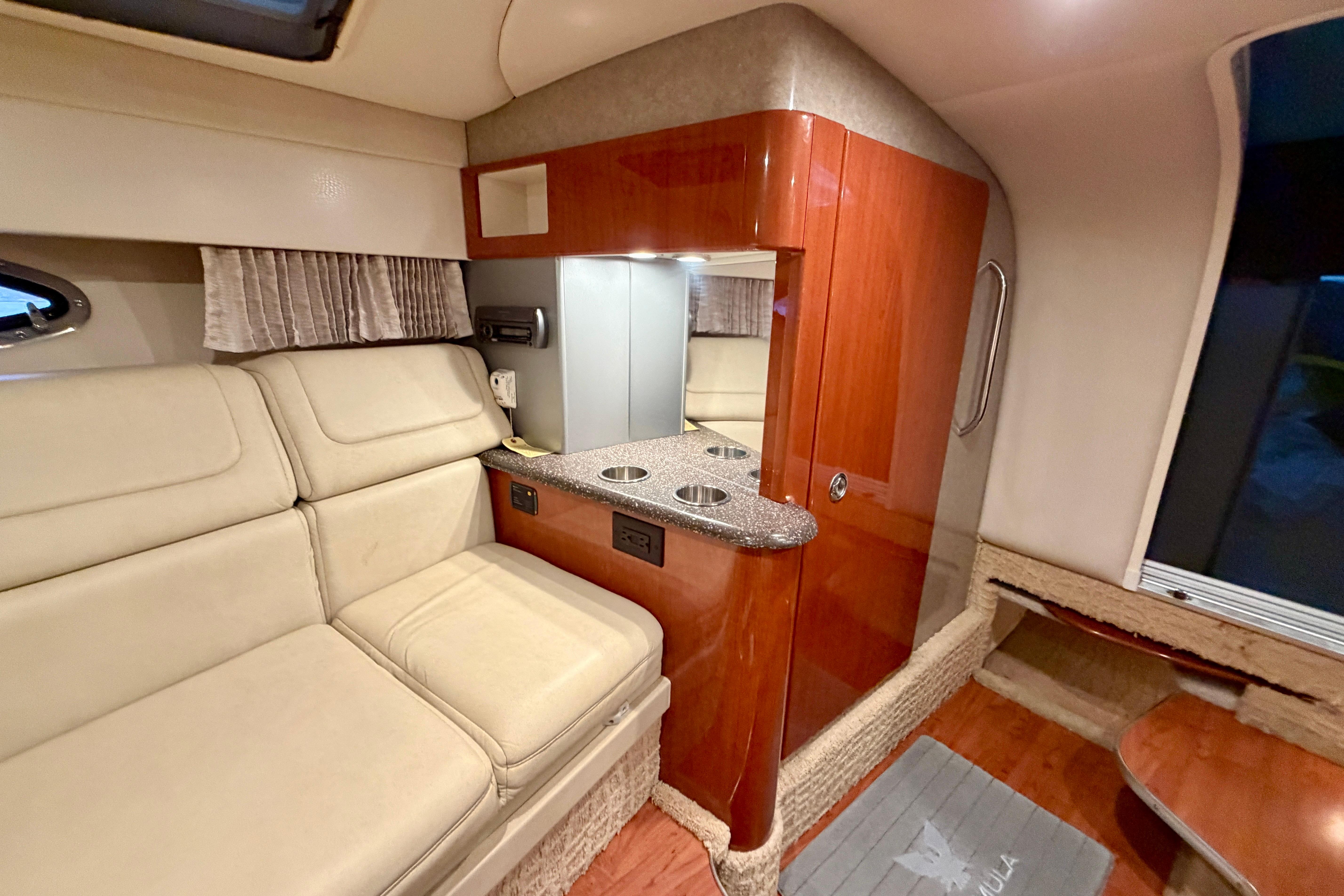 Deck: Walk-thru transom, walk-thru windshield with integrated steps, built in floor cooler, screen for cabin, wetbar with storage and sink, transom fender storage.