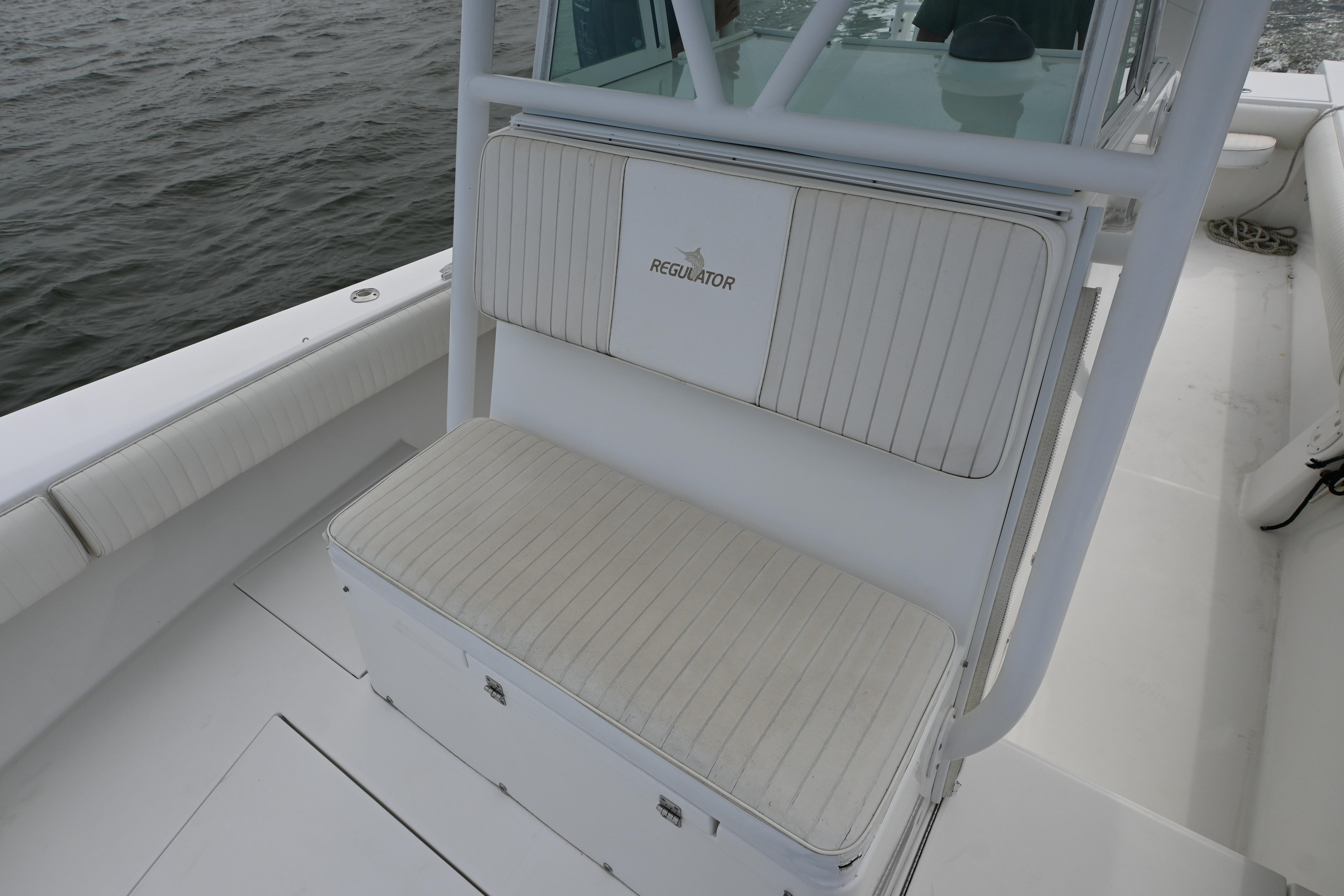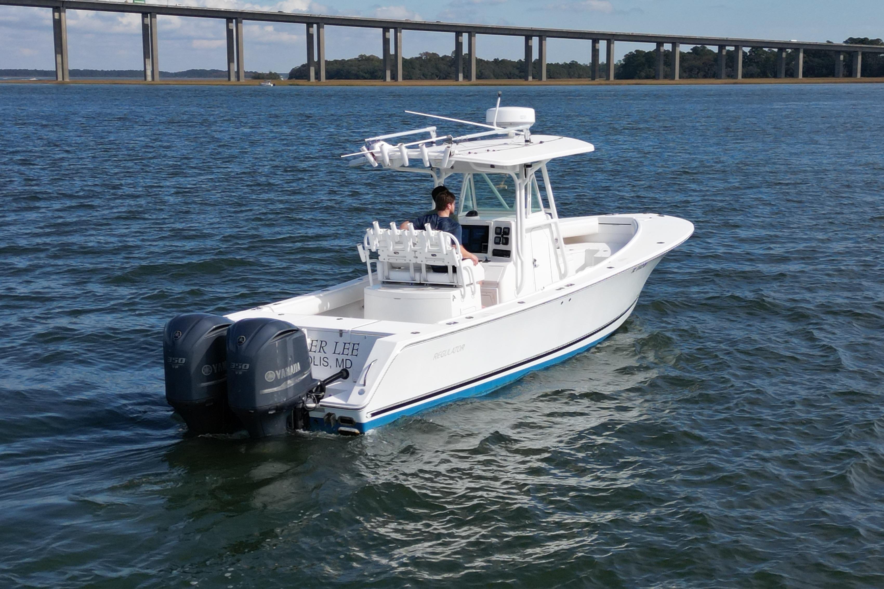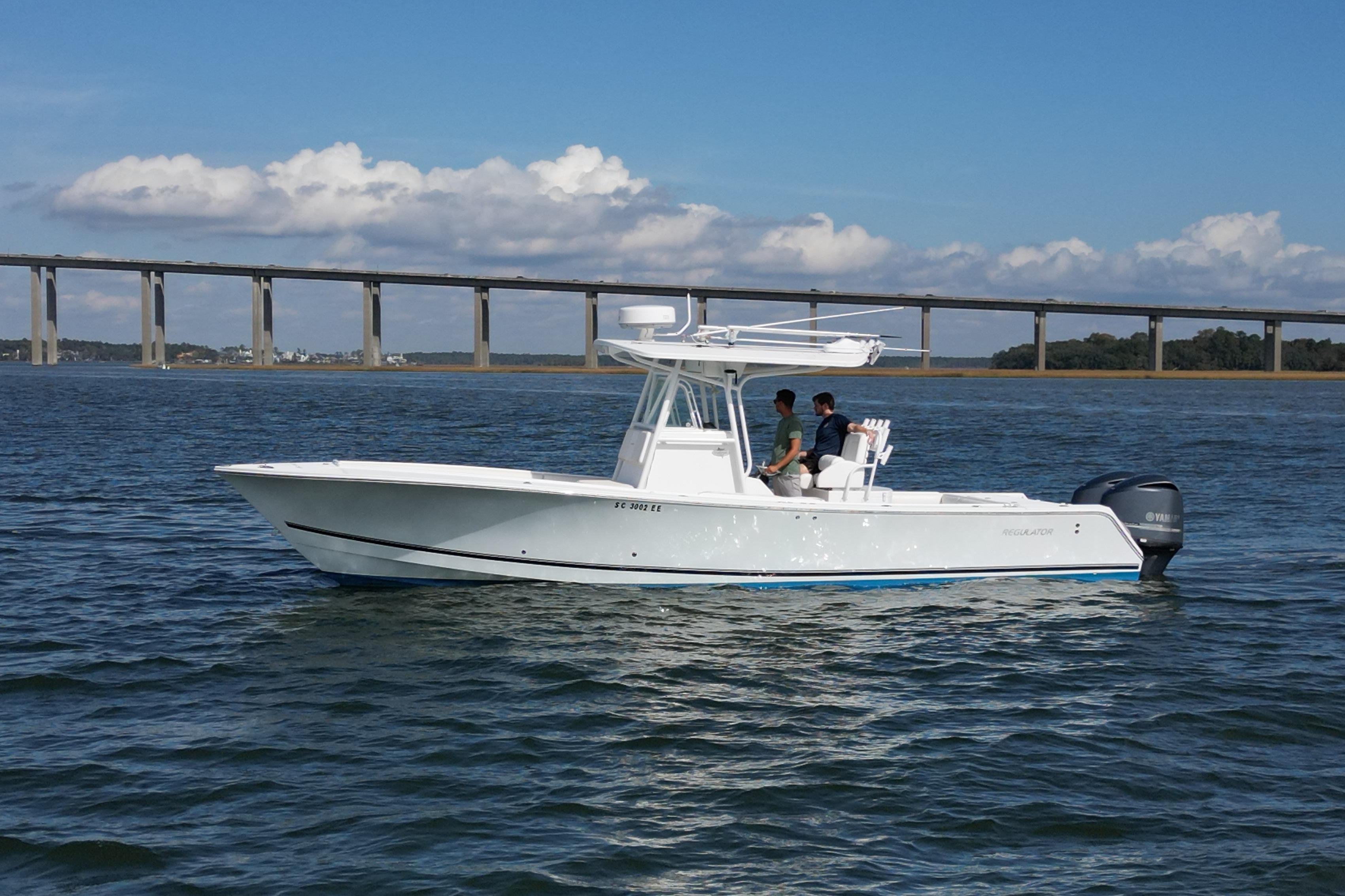 The Regulator 32FS is not for the squeamish? It's pure sportfishing dynamite! Start with the legendary ride built into every Regulator. Many call it the smoothest and most solid ride they've ever felt. It comes from Regulator's exclusive Fiberglass Grillage System, a rigid framework encased in the hull that acts as the armored backbone of the boat. Combined with an extra thick all-fiberglass hull made from the finest resins and gelcoats available, the 32 can withstand the most punishing sea states, and thanks to its deep-V sharp-entry bow and Carolina-flare design, the ride is also dry and comfortable. The Regulator 32 FS provides a level of standard accommodations and fishing features that raises the bar out of sight for the competition. Thickly padded forward seating for five rests atop twin 220-quart wet or dry storage boxes, while 360-degree coaming pads encompass the boat to cushion backs and knees. Some of the extra features that make the Regulator 32FS stellar are a 645-quart in-deck locking fish/rod storage box; 64-quart cooler under the front bench seat; fiberglass-lined 6'2" stand-up head with 35-gallon shower and sink; walk-through transom door; and combination leaning post/rigging station that houses a freshwater sink with insulated bait tray tackle storage, five rocket launchers, and rigging racks. The Regulator 32?s impressive storage capacity continues with a 40-gallon recirculating livewell and 130-quart fish box in the transom, as well as a glove box and under-console dry storage bin. Two additional locking rod storage boxes are at the forward steps.For power and control, the Regulator 32FS relies on dependable Yamaha. Their Command Link Digital Network Information System features precise digital readouts of important functions on the twin Yamaha F250 four-stroke outboards with 700 horsepower. All electronics are flush mountable and are lockable behind a panel at the helm. Stainless steel fuel/water separating filters keep the lines clear, and stainless steel props provide the twist. Standard 22? x 14? Lenco tabs allow for precise trim response. Combined with Teleflex tilt and power assist steering and an Edson polished silver wheel with Power Knob, you get an easy handling powerful deepwater stalker. Popular options for the serious angler include a solid fiberglass T-top with pre-wired electronics box, t-top mounted silver-anodized five-rod rocket launcher, custom three-sided weather curtain enclosure, and 18-foot Lee Sidewinder outriggers with laydown mounts.