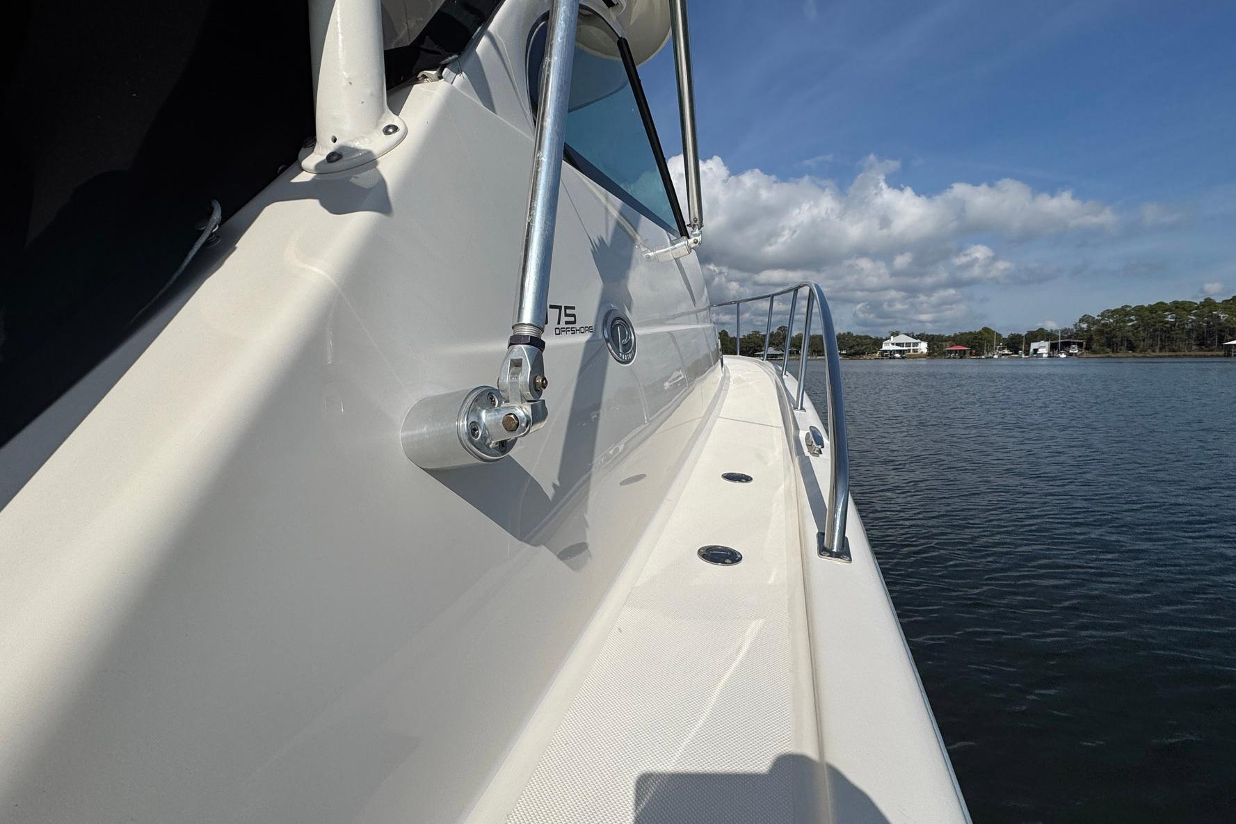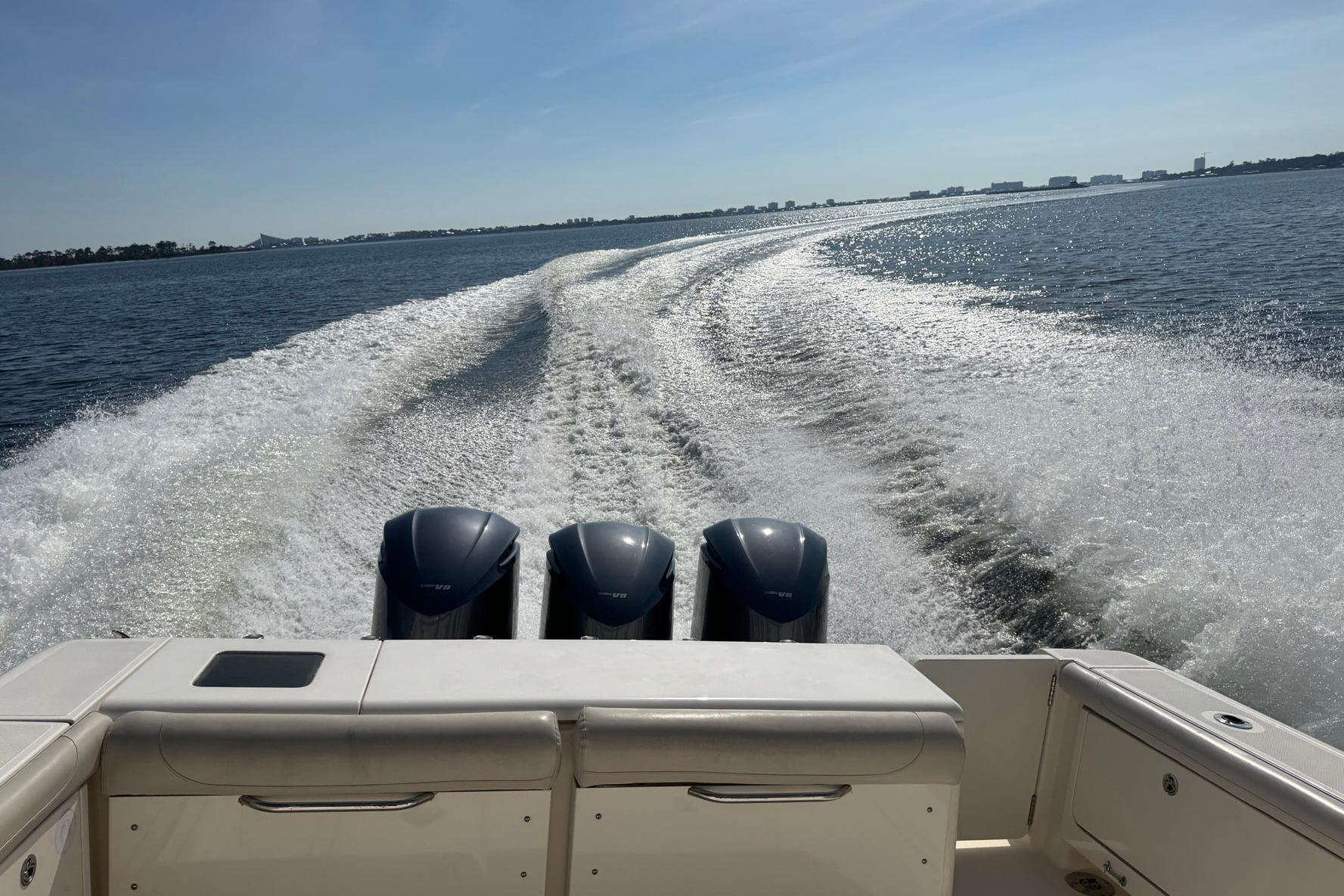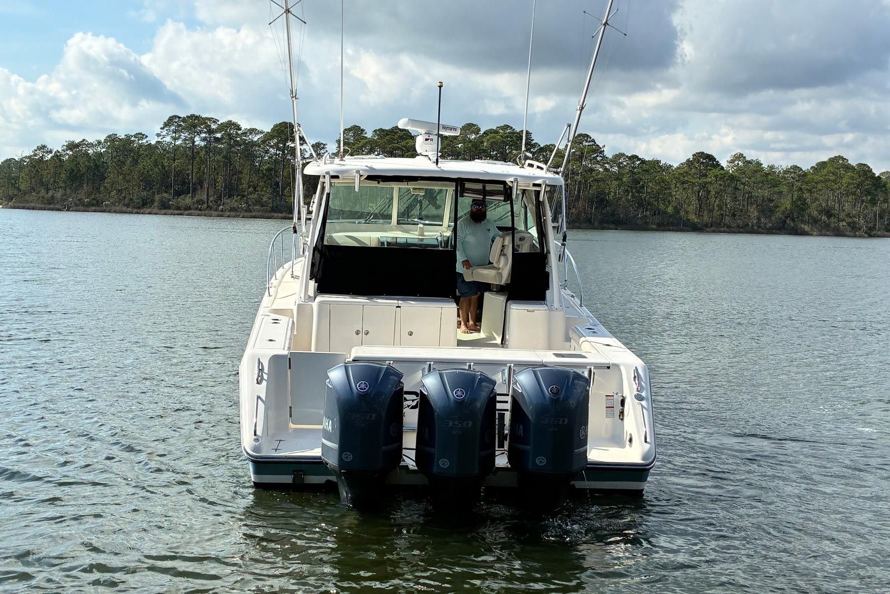 Very nice Pursuit 375OS with triple Yamaha F350 four stroke outboards! Kept in a covered slip and well maintained. The Pursuit 375OS a high-end express-style sportfishing boat known for combining offshore fishing capabilities with luxury and comfort. It features a large cockpit with numerous fishing amenities and a well-appointed cabin with high end wood work throughout. Key features include excellent storage, a standard bow thruster, a well-integrated windshield, and a comfortable helm with good visibility and performance from triple outboard engines. An in-transom freezer/cooler of 75-gallons and helm freezer/cooler of 64-quarts are two of the nicer fishing amenities while full sized outriggers, in deck fish boxes and a 50-gallons livewell are for the serious angler. The separate Helm Deck Air Conditioner (with reverse cycle heat), cockpit sink, storage, and built in grill are top notch additions for a day on the water.