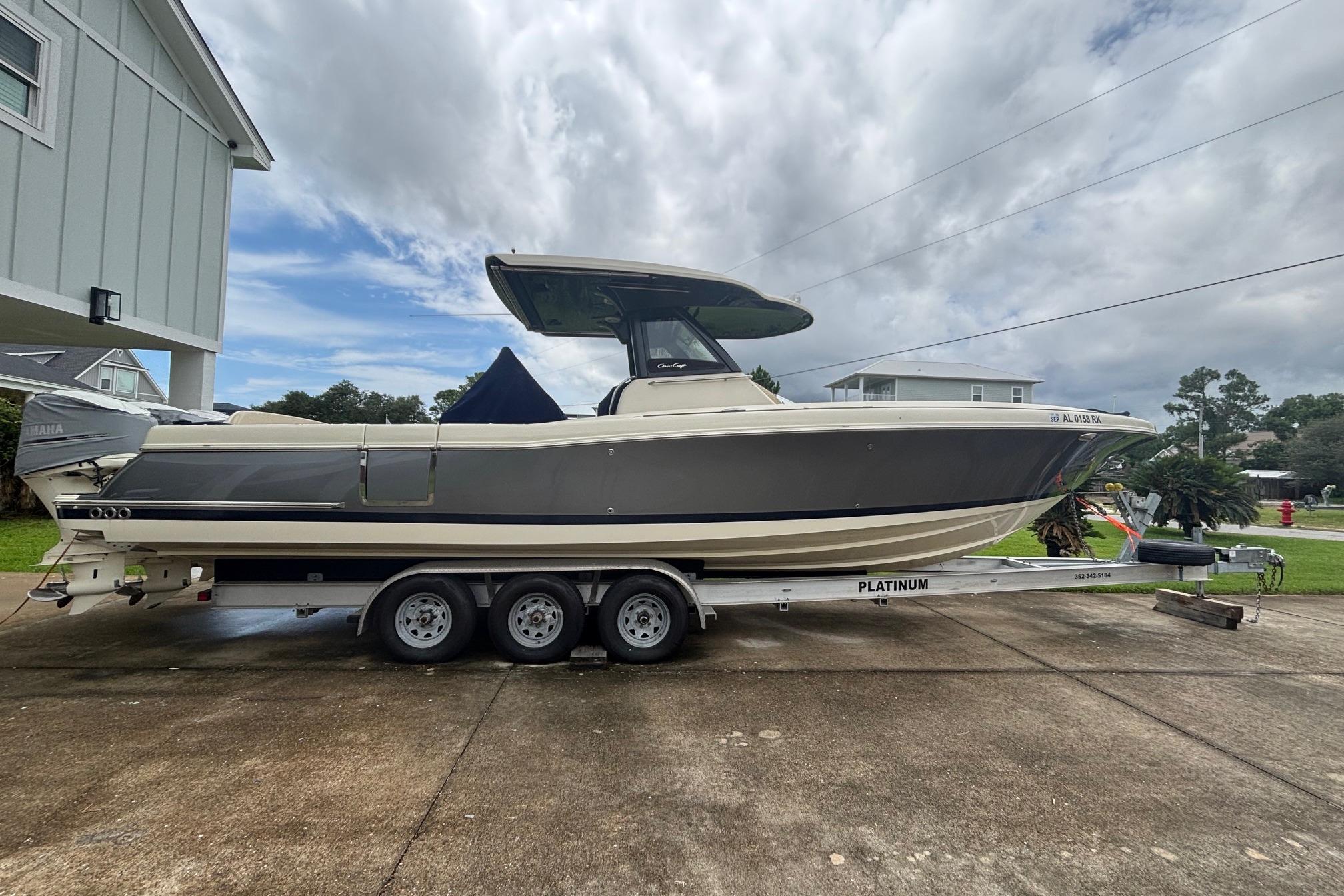 Introducing the 2018 Chris-Craft 350 Catalina, a stunning center console boat that perfectly blends performance and luxury. With an overall length of 35 feet, this vessel boasts a sleek fiberglass hull designed in a deep Vee shape, ensuring a smooth ride even in choppy waters. Powered by triple robust 300 hp Yamaha outboard engines, it reaches cruising speeds of 35 mph and has a maximum hull speed of 50 mph, making it ideal for thrilling adventures on the water. The boat accommodates up to 20 passengers, providing ample space for gatherings and outings. Equipped with an electric windlass, it enhances convenience during anchoring. With a range of 400 miles, the 350 Catalina is perfect for extended excursions. Enjoy the comfort of one cabin and one head, making it a great choice for both day trips and overnight stays. This used model combines modern features with classic craftsmanship, ready for its next adventure.
