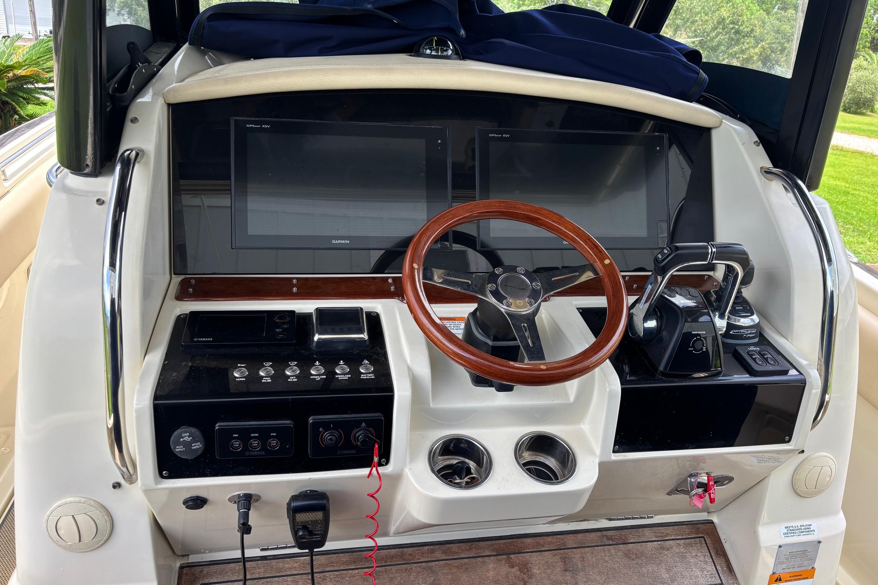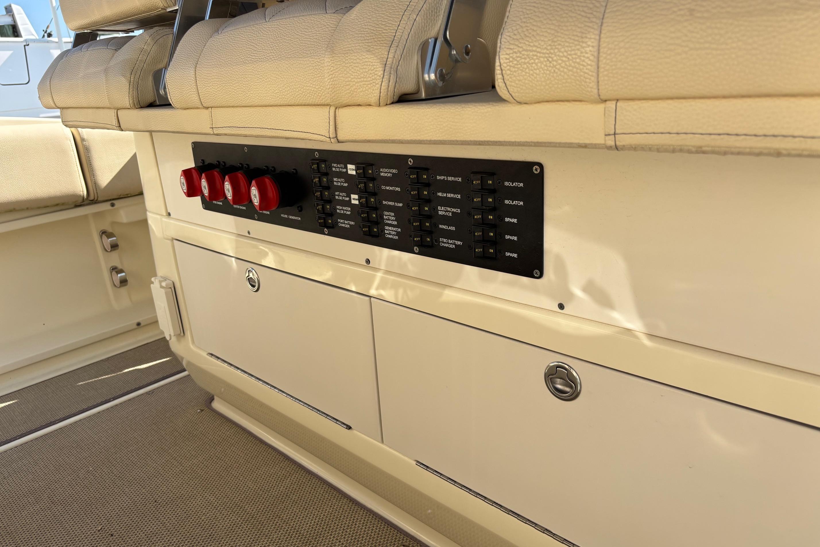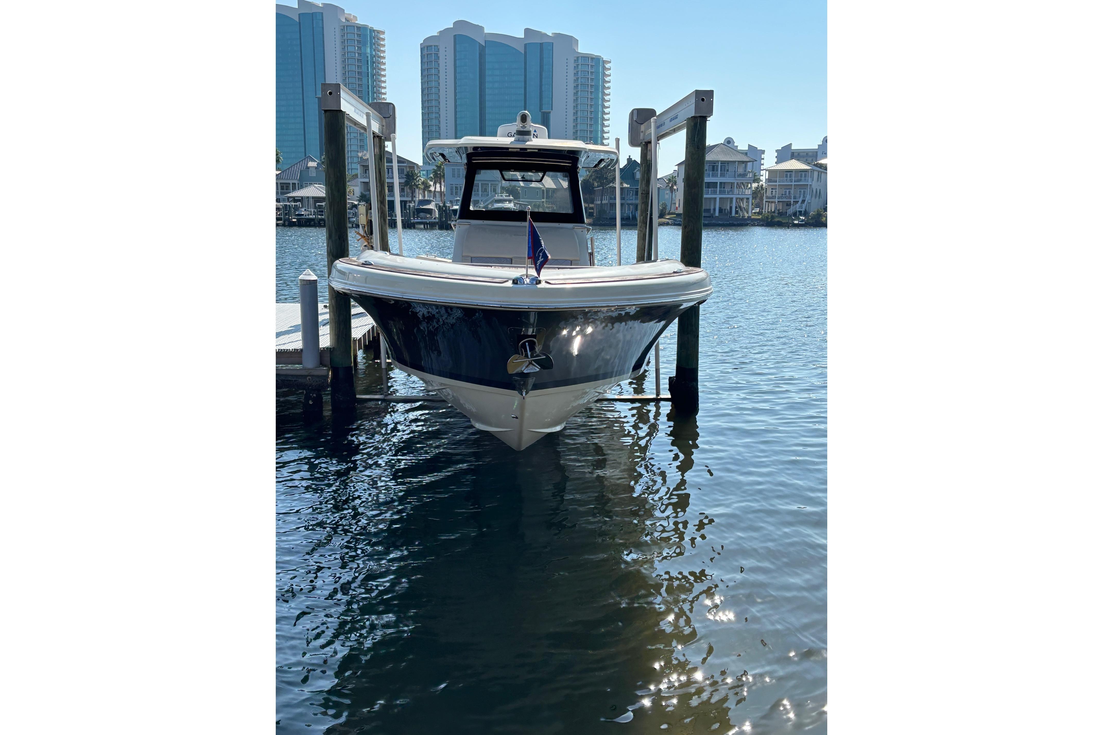 This Boat has every option available but not limited to. Fresh water Maker, Ice Maker, 5.0 KW 120/240-volt Generator , A/C, Rear retractable sun shade, Flir Night Vision. Garmin Radar, VHF and GPS. Fuel capacity is 322 gallons. Optimus Joystick for single lever operation, Fly-By-Wire throttles. New Optima Batteries - D27800CCA. Electric head, Sewage disposal system with holding tank. Single cabin inside the console featuring double berth, head and sink. Lewmar Pro Series winch, Delta Plow anchor with 300' of chain rope. Water Tap, Cockpit Refrigerator, Microwave, 2 burner stove top, and grill.Fusion stereo system with amplifier and multiple speakers operable from the helm and remote locations.