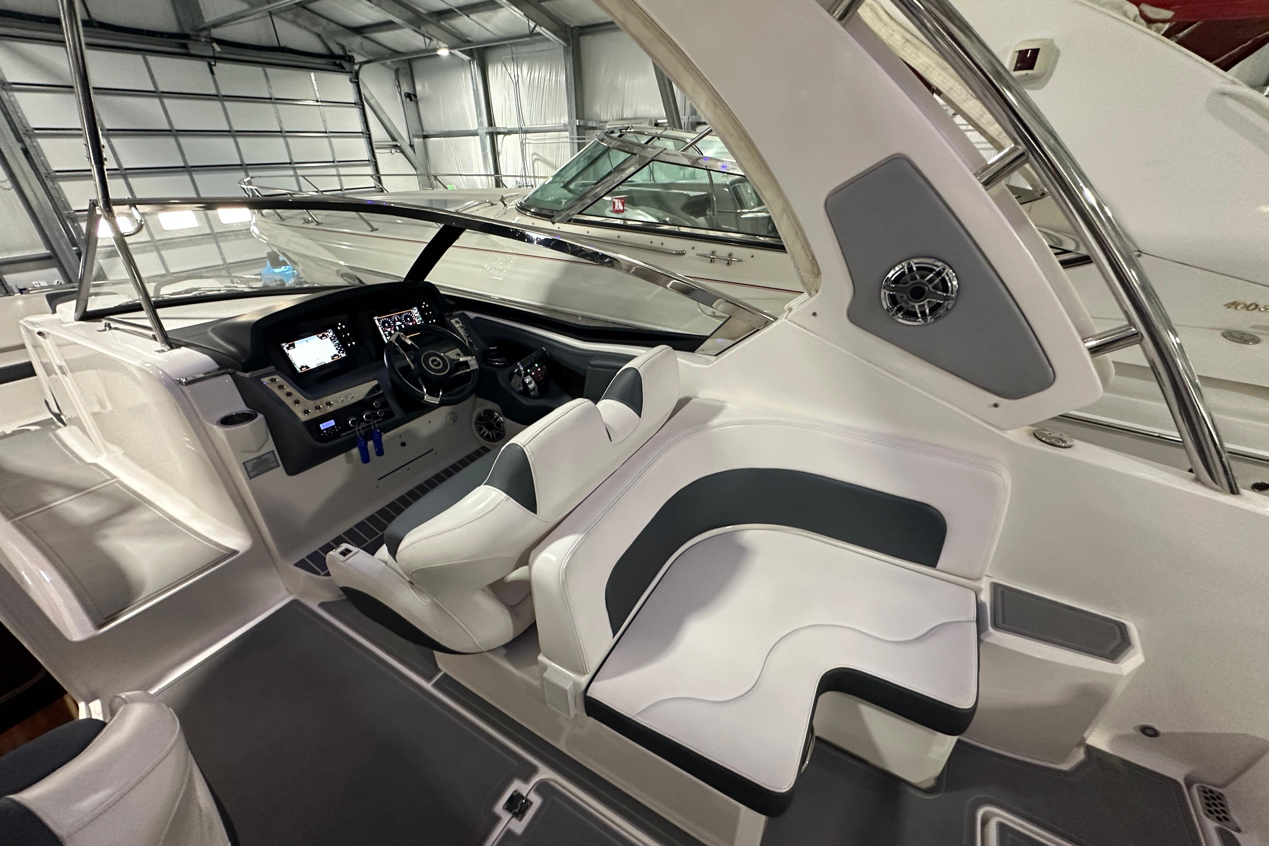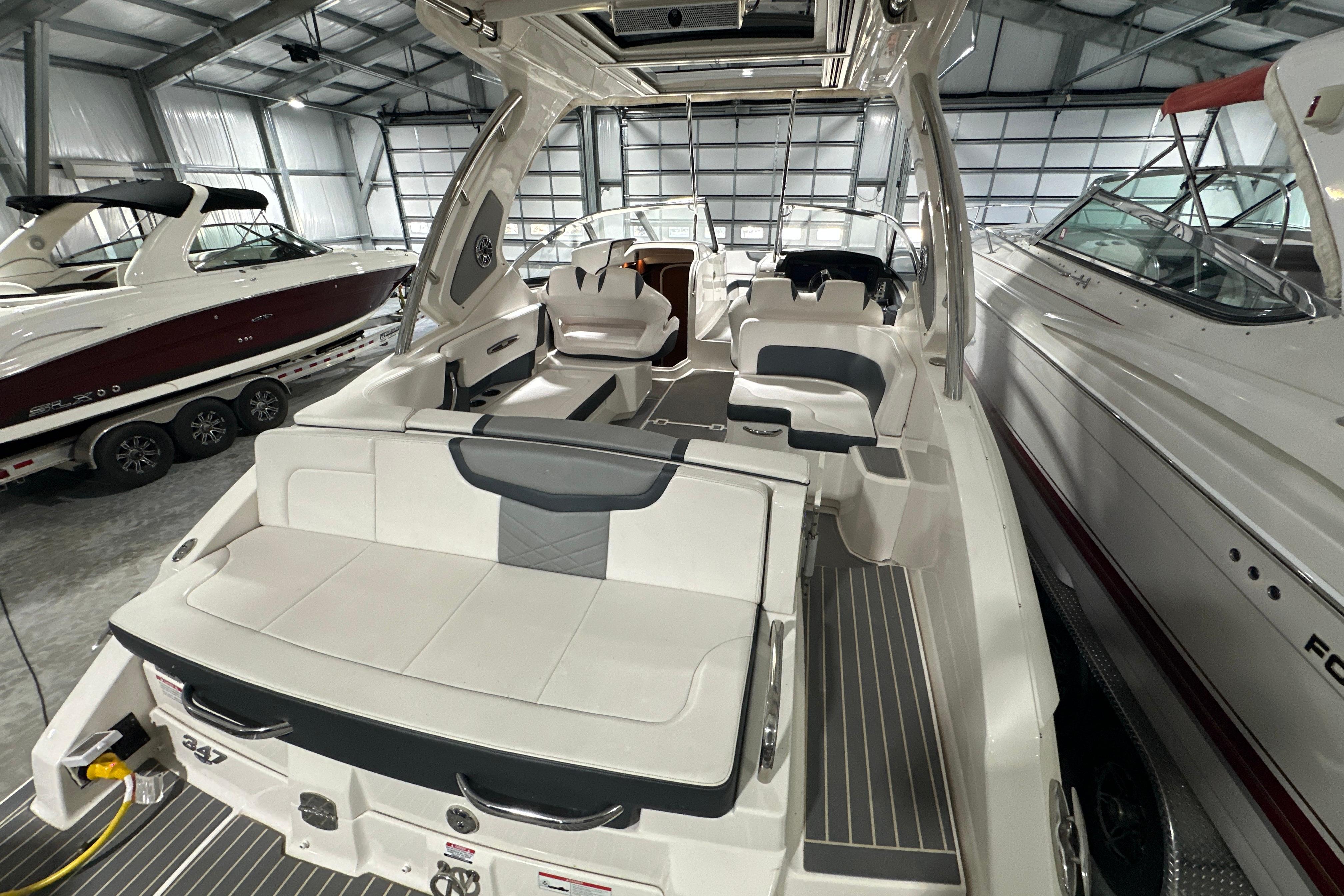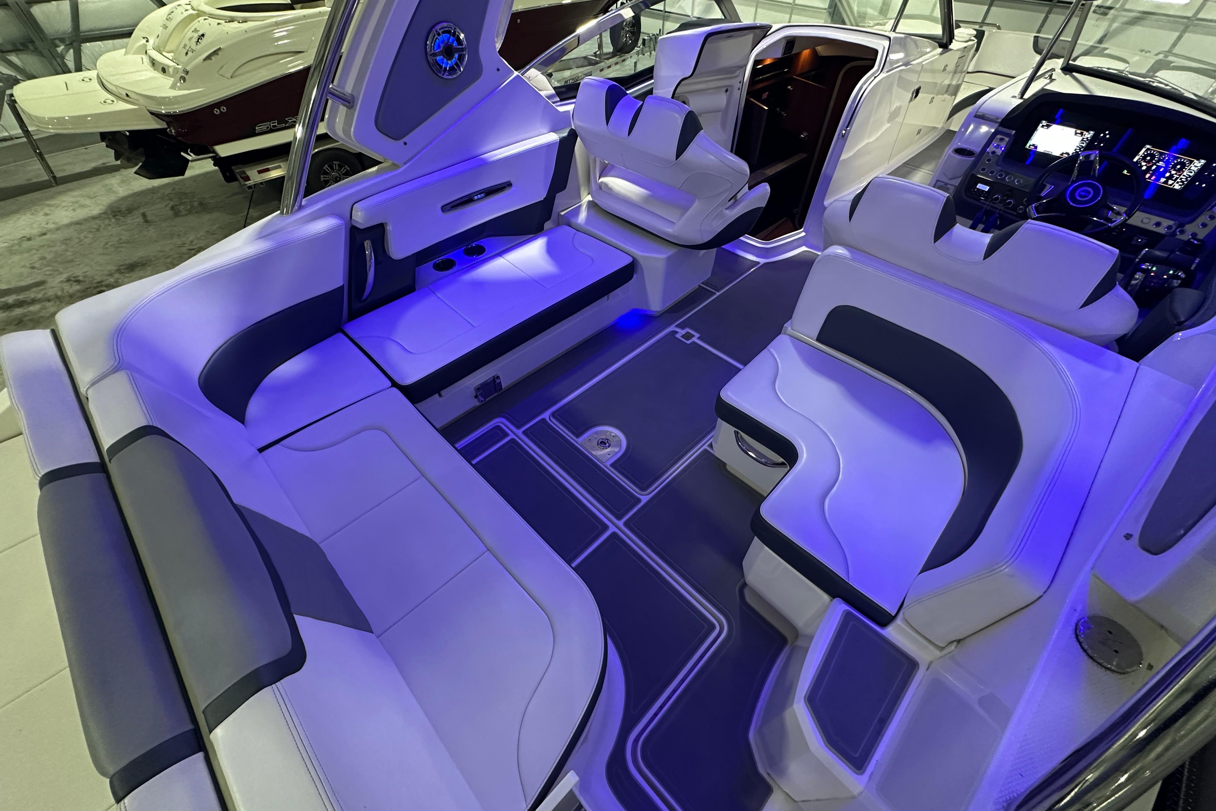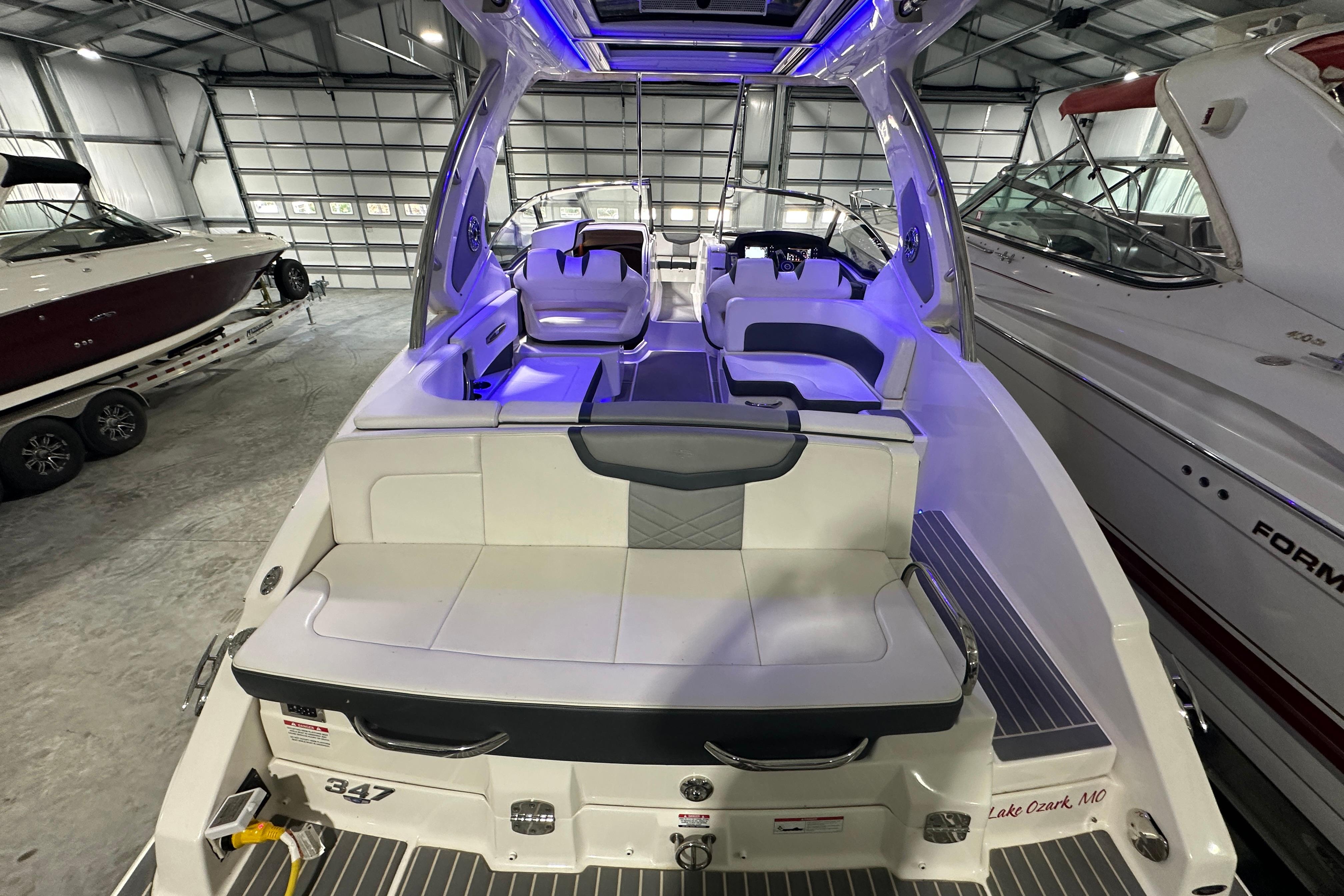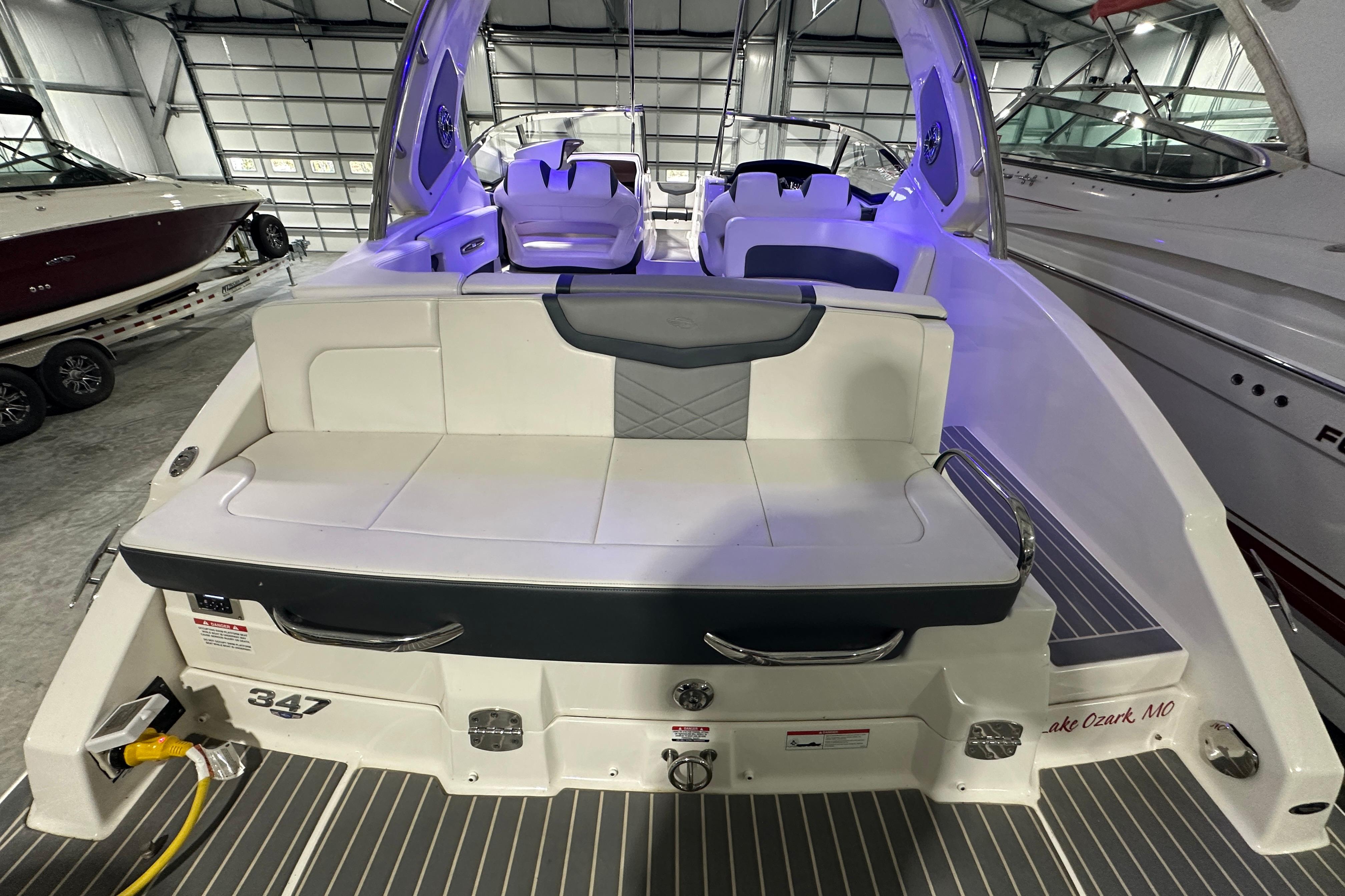 The amazing 347 SSX offers the most demanding of boaters the best of both worlds with a supersized bowrider layout and a full-beam enclosed cabin. We've never built a boat more versatile or impressive than the 347 SSX. Massive seating capacity. Luxury appointments. Clever features. Go anywhere performance. But the real magic of Chaparral innovation happens when you open the port side entry door and discover a space defying lavish full beam cabin. While most rivals at this length settle for a split beam design where neither area satisfies, the 347's unified cabin comes complete with an entertainment console, enclosed head and overnight accommodations for two.