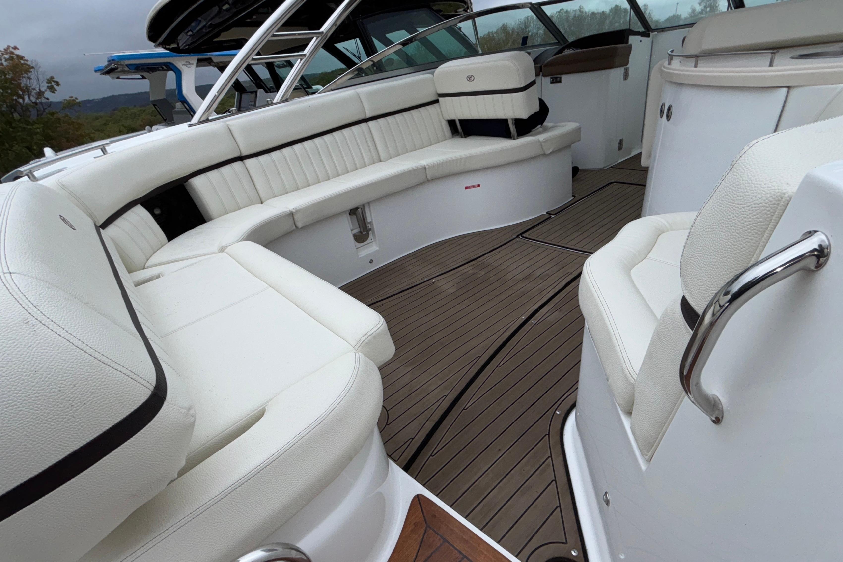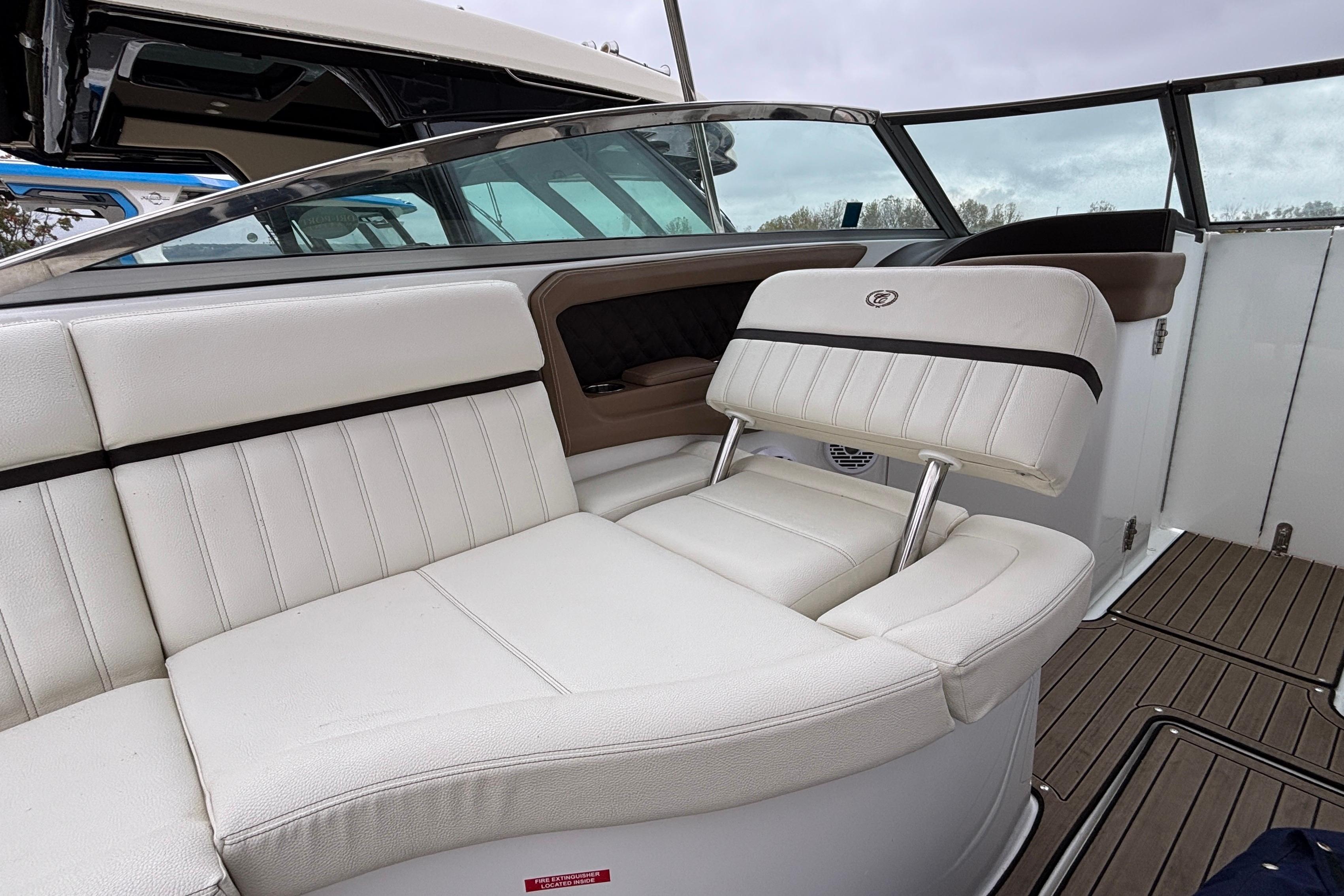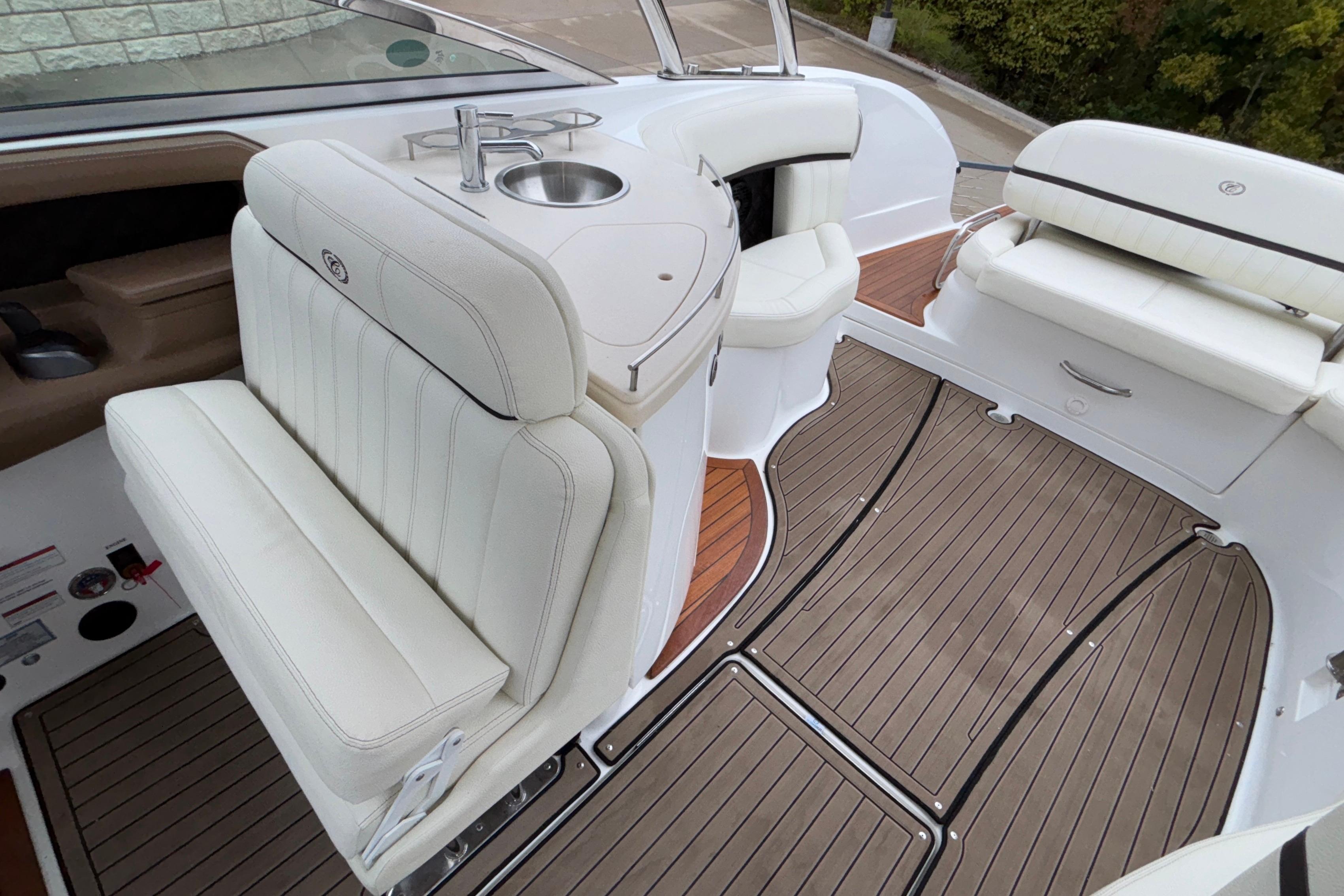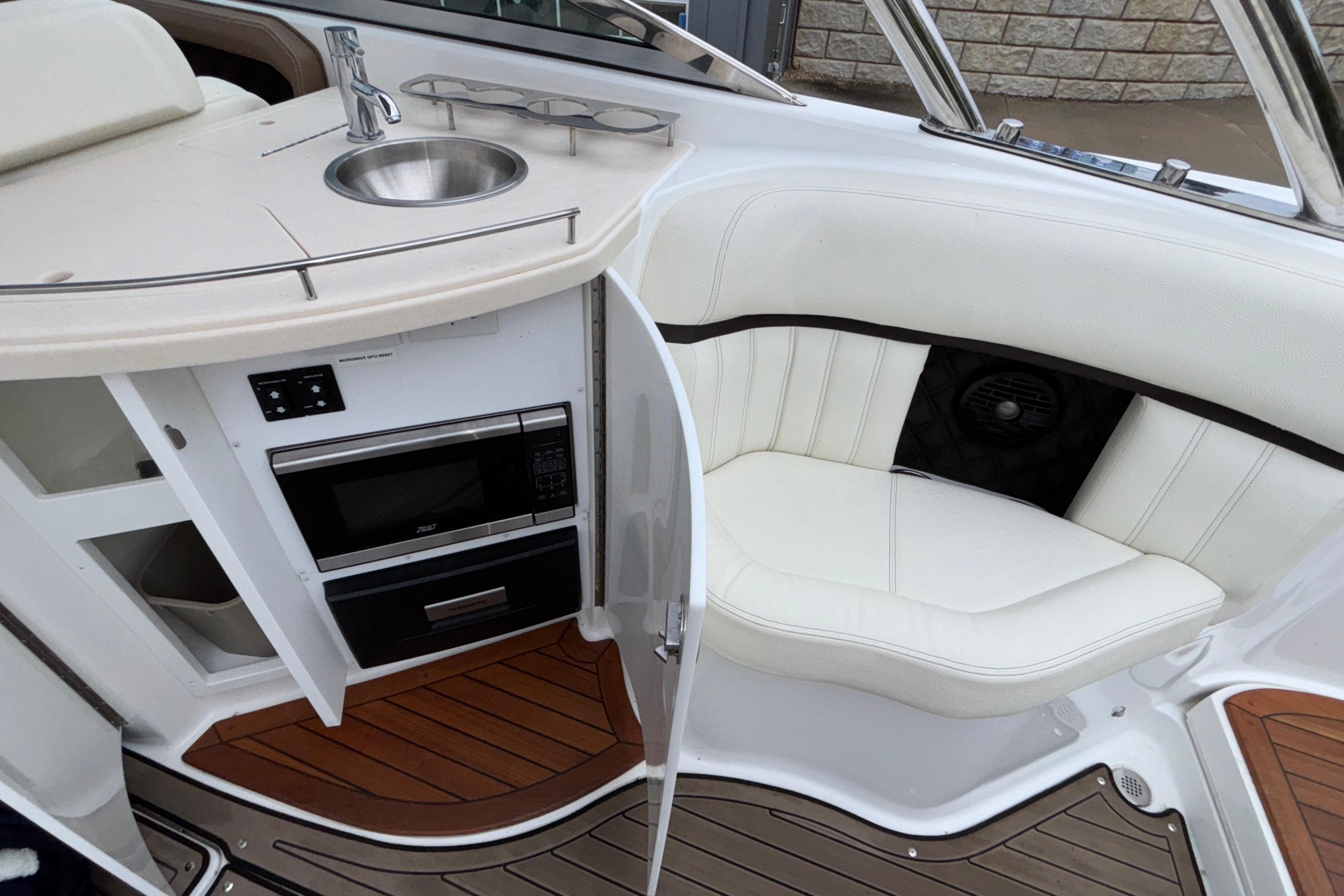 This boat's additional features include: Depth & Water/Air Temp Gauge Pkg., Gloss Black Dash Console w/Dual Garmin Screens, Hour Meters, Premium Black Leather/SS Steering Wheel, Anchor Locker w/Windlass Anchor, Stainless Steel Arch w/Hard Top & Retractable Sun Shade, Hideaway Cockpit Dinette Table, Swim Platform w/Hydraulic Step, Teak Inserts at Helm Step, Transom and Transom Walk-thru, Snap-In Mat Flooring throughout Cockpit and Mat Flooring on Swim Platform, Dinette Table w/Bow,CP & Cabin Recept., Double Wide Helm Seat, Galley in Cockpit w/Sink, Microwave & Cooler, Head Compartment w/Shower & Head w/VacuFlush and Bow & Cockpit Snap Canvas Covers.