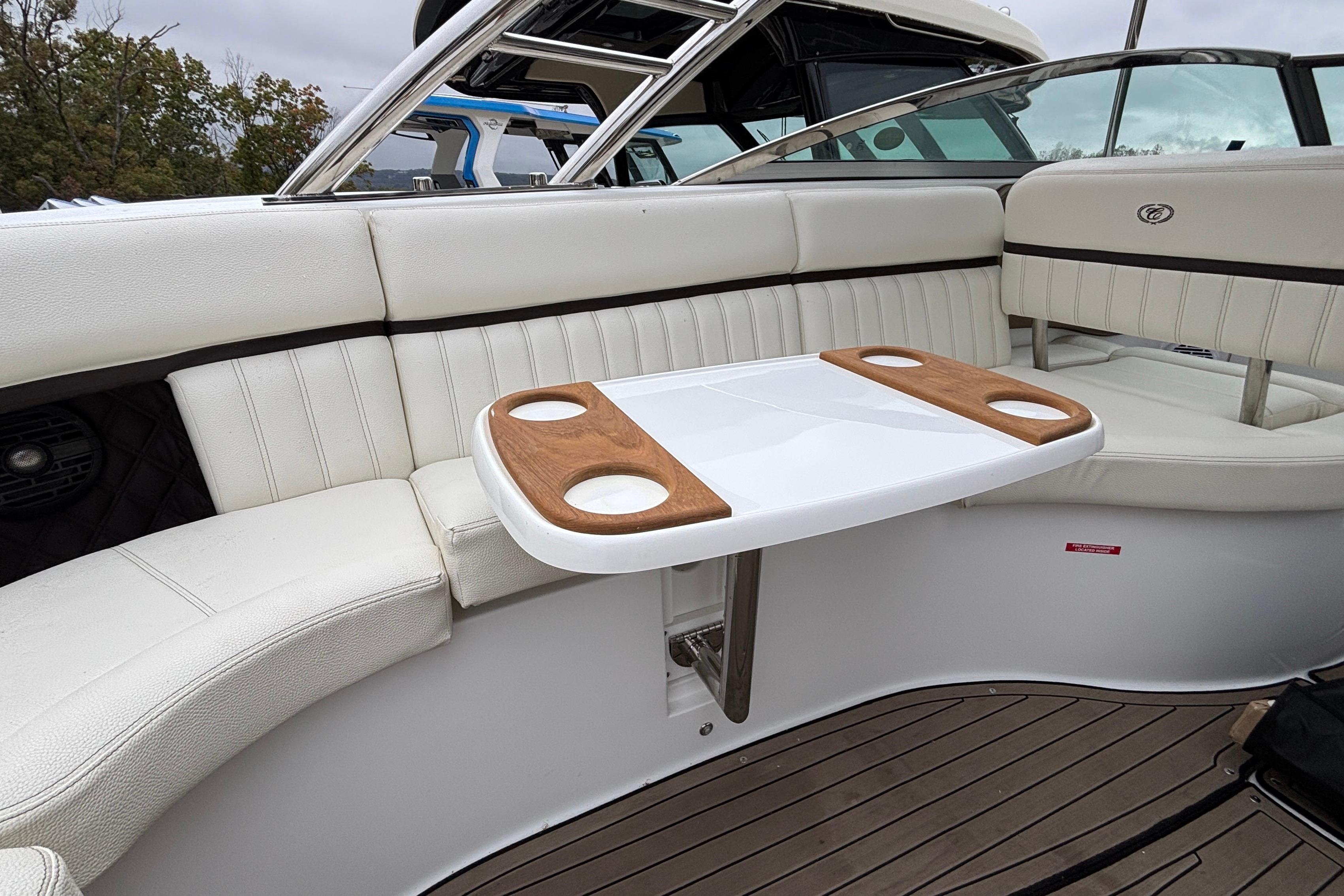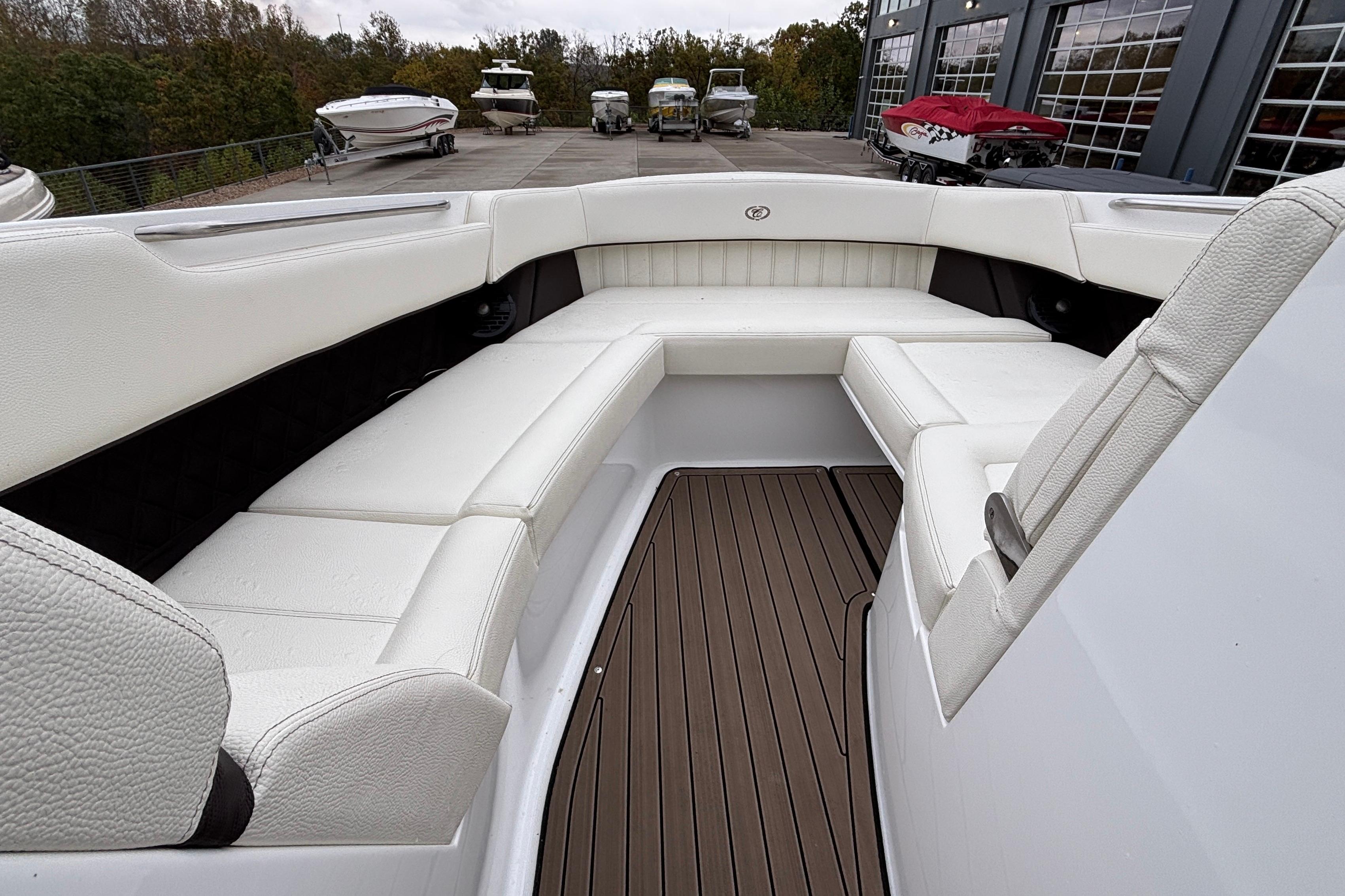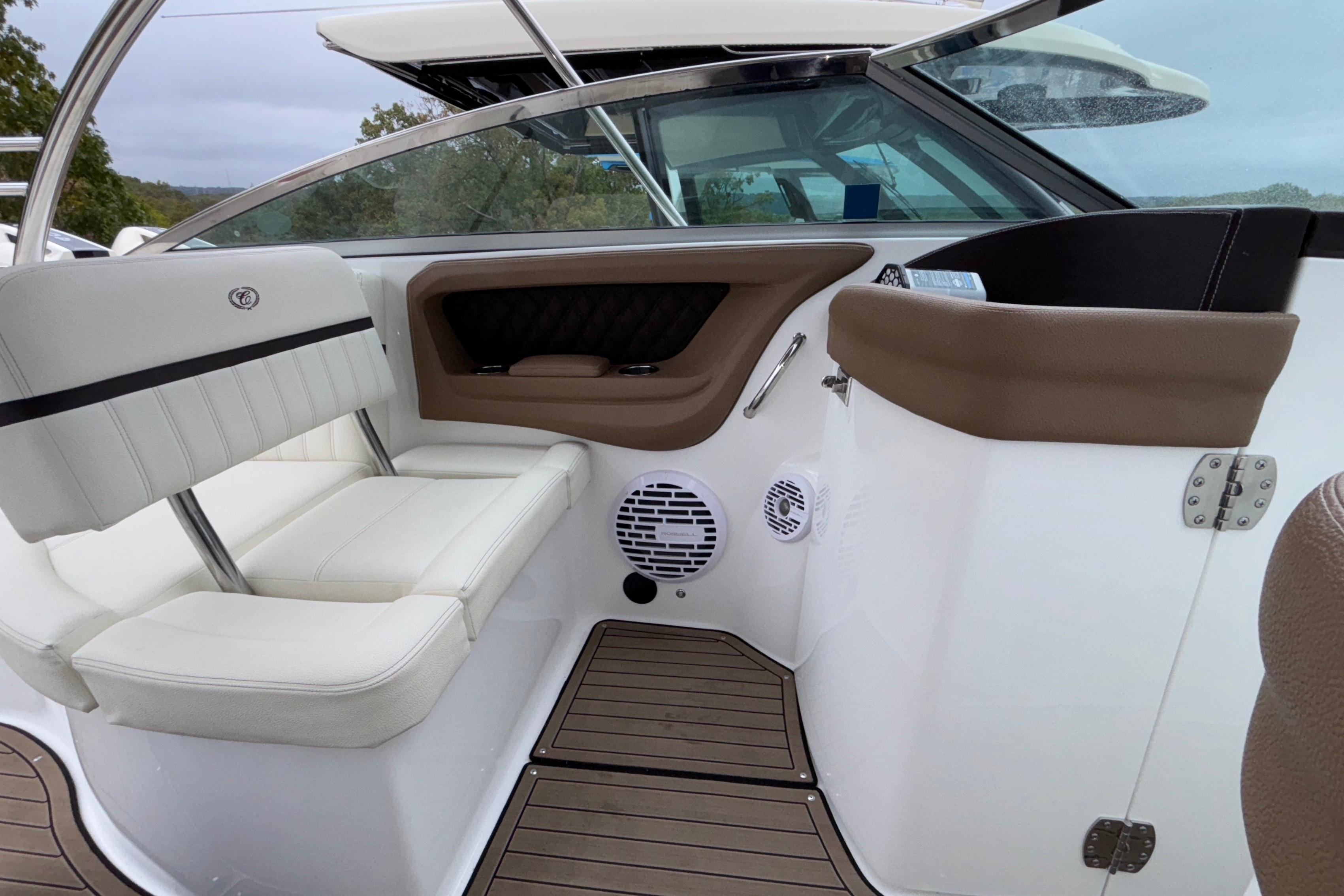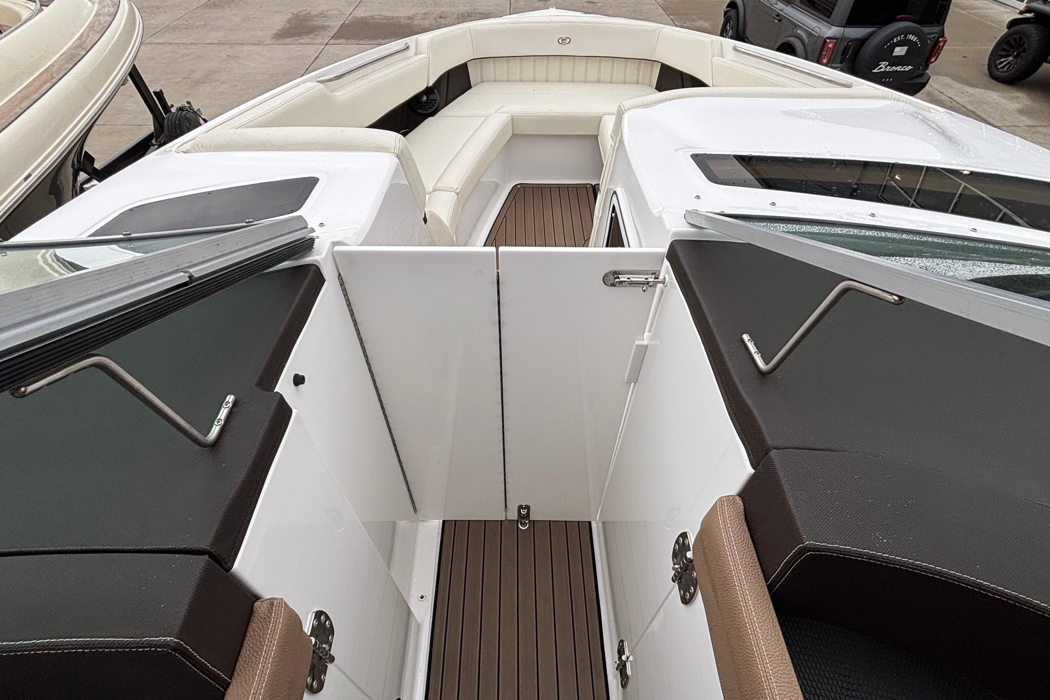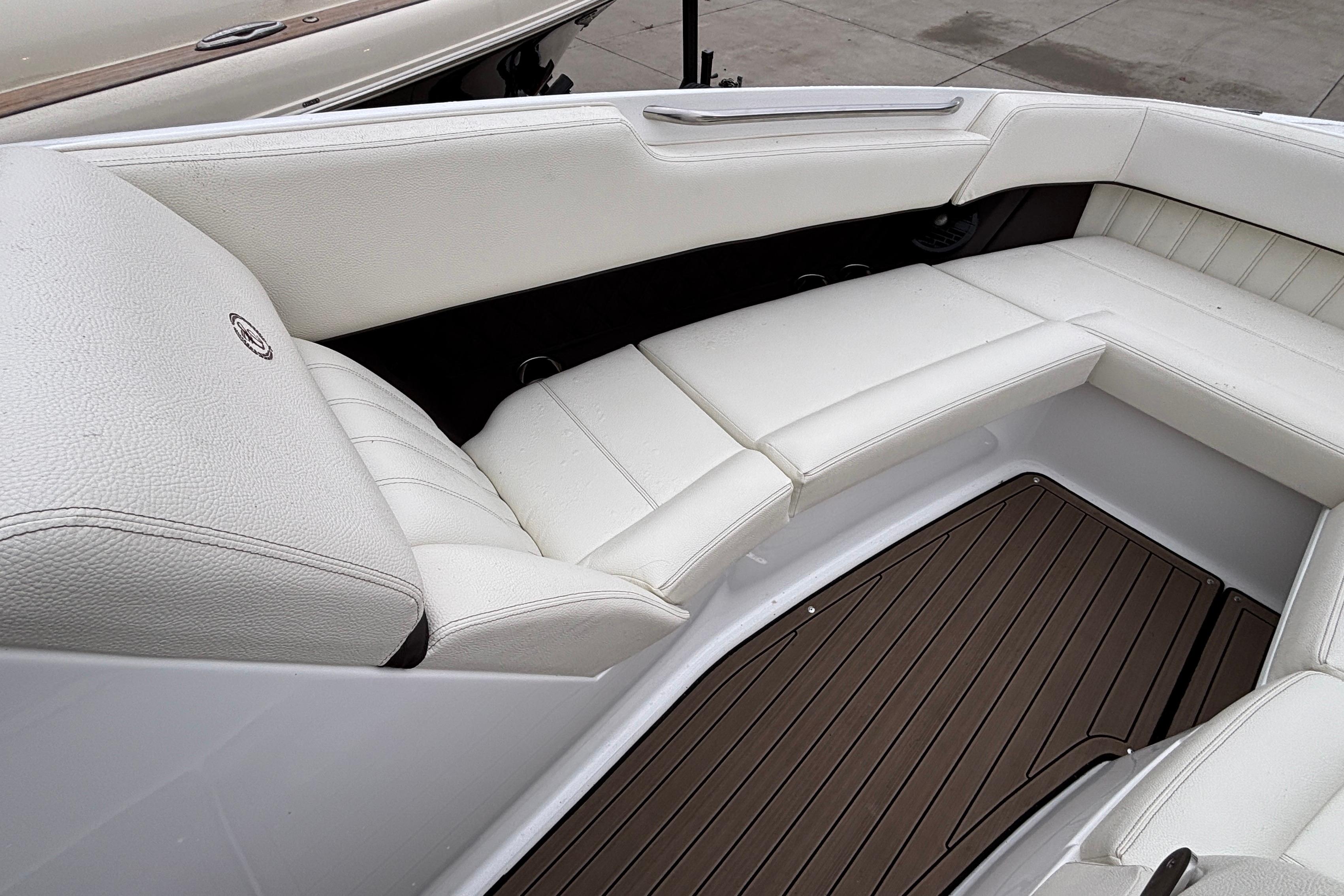 This boat's additional features include: Depth & Water/Air Temp Gauge Pkg., Gloss Black Dash Console w/Dual Garmin Screens, Hour Meters, Premium Black Leather/SS Steering Wheel, Anchor Locker w/Windlass Anchor, Stainless Steel Arch w/Hard Top & Retractable Sun Shade, Hideaway Cockpit Dinette Table, Swim Platform w/Hydraulic Step, Teak Inserts at Helm Step, Transom and Transom Walk-thru, Snap-In Mat Flooring throughout Cockpit and Mat Flooring on Swim Platform, Dinette Table w/Bow,CP & Cabin Recept., Double Wide Helm Seat, Galley in Cockpit w/Sink, Microwave & Cooler, Head Compartment w/Shower & Head w/VacuFlush and Bow & Cockpit Snap Canvas Covers.