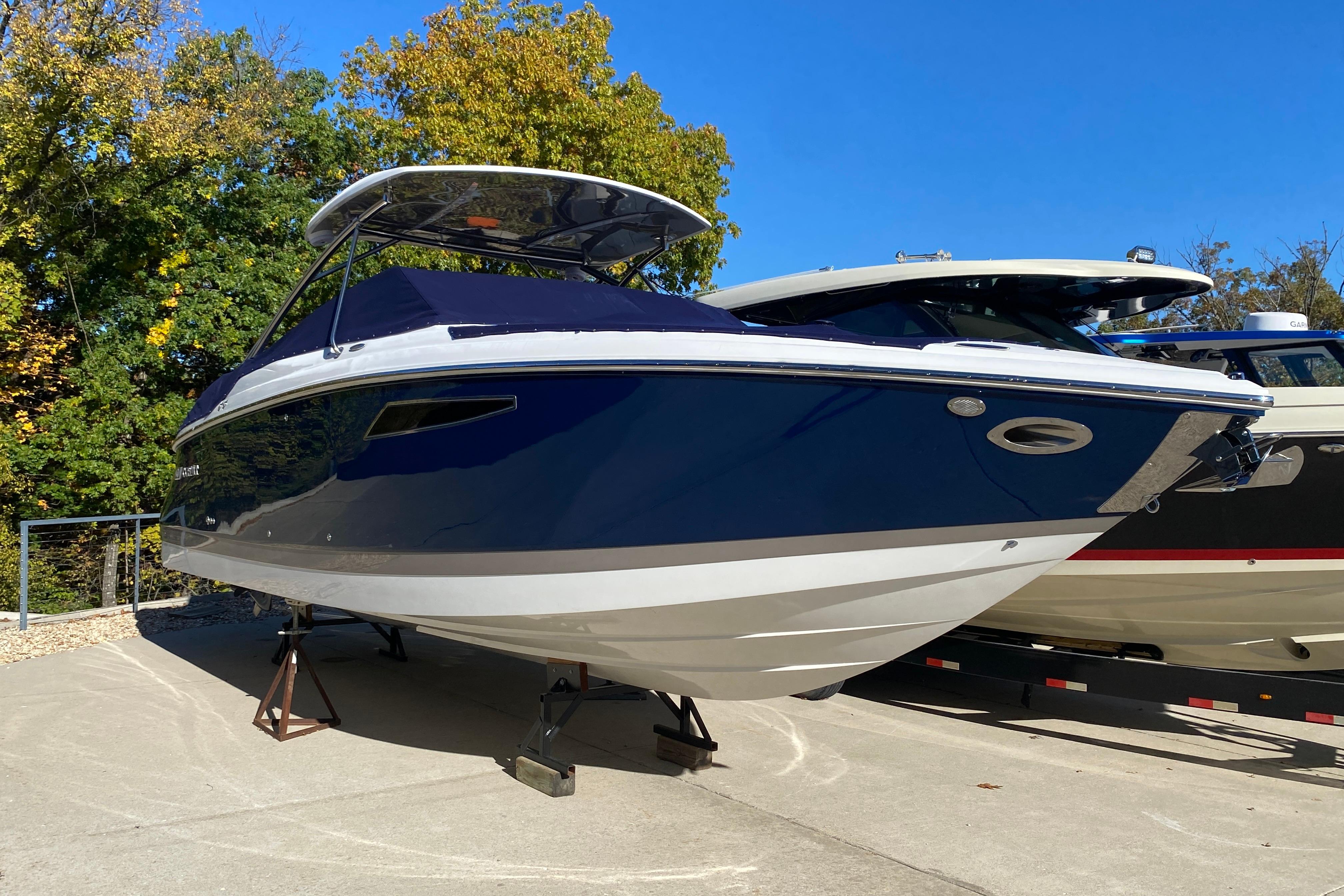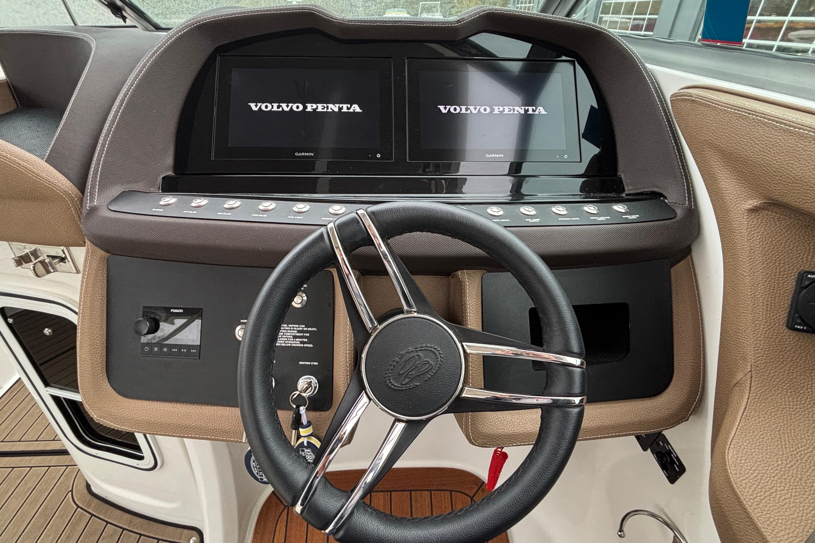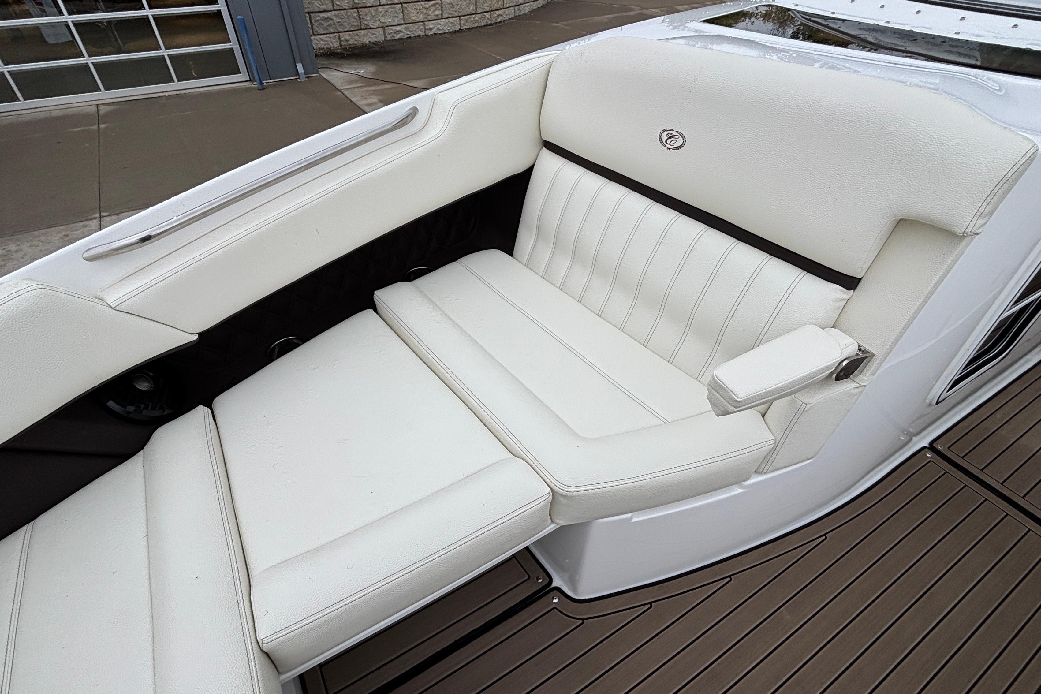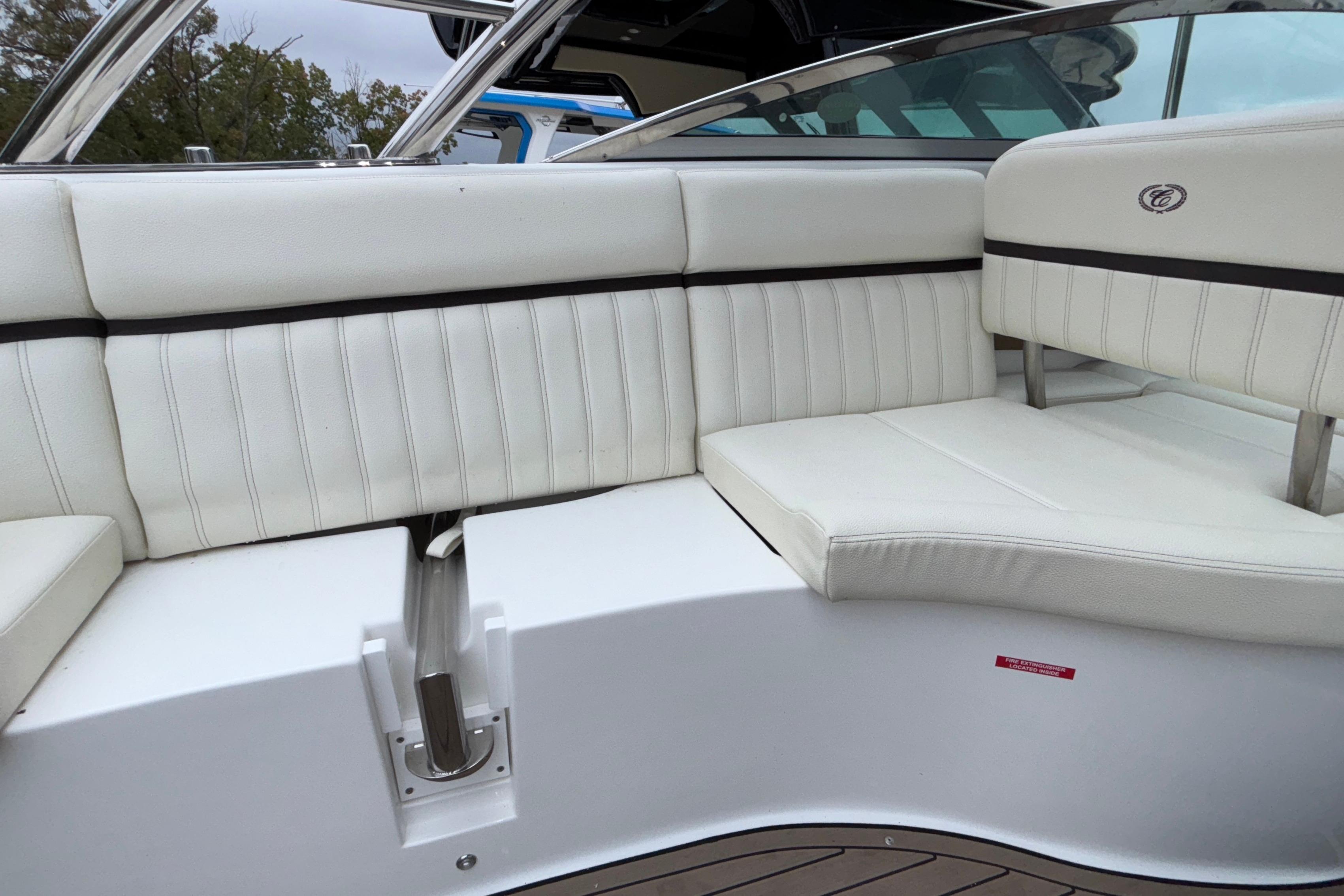 This boat's additional features include: Depth & Water/Air Temp Gauge Pkg., Gloss Black Dash Console w/Dual Garmin Screens, Hour Meters, Premium Black Leather/SS Steering Wheel, Anchor Locker w/Windlass Anchor, Stainless Steel Arch w/Hard Top & Retractable Sun Shade, Hideaway Cockpit Dinette Table, Swim Platform w/Hydraulic Step, Teak Inserts at Helm Step, Transom and Transom Walk-thru, Snap-In Mat Flooring throughout Cockpit and Mat Flooring on Swim Platform, Dinette Table w/Bow,CP & Cabin Recept., Double Wide Helm Seat, Galley in Cockpit w/Sink, Microwave & Cooler, Head Compartment w/Shower & Head w/VacuFlush and Bow & Cockpit Snap Canvas Covers.