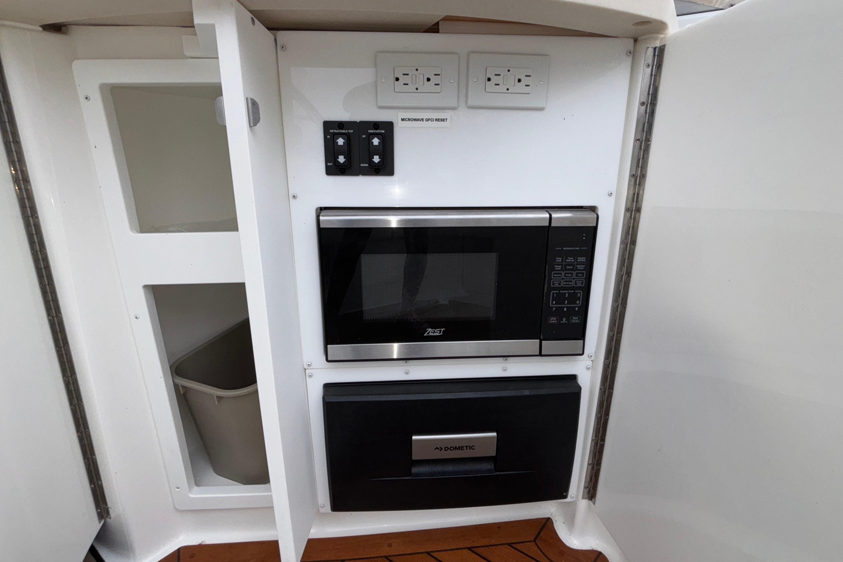 The cabin is capable of sleeping two adults and comes with plug-in dockside air conditioning and reverse air heat. Inside, a cabinet designed for entertainment comes a 32" LCD HD television, a DVD player, and a play-station hookup.