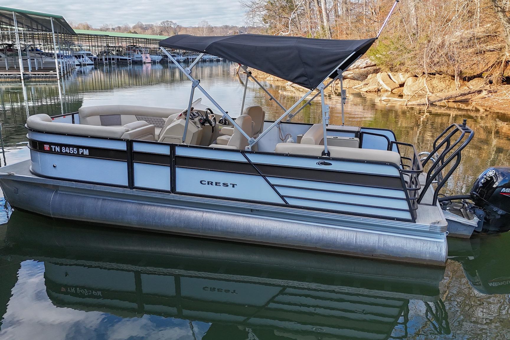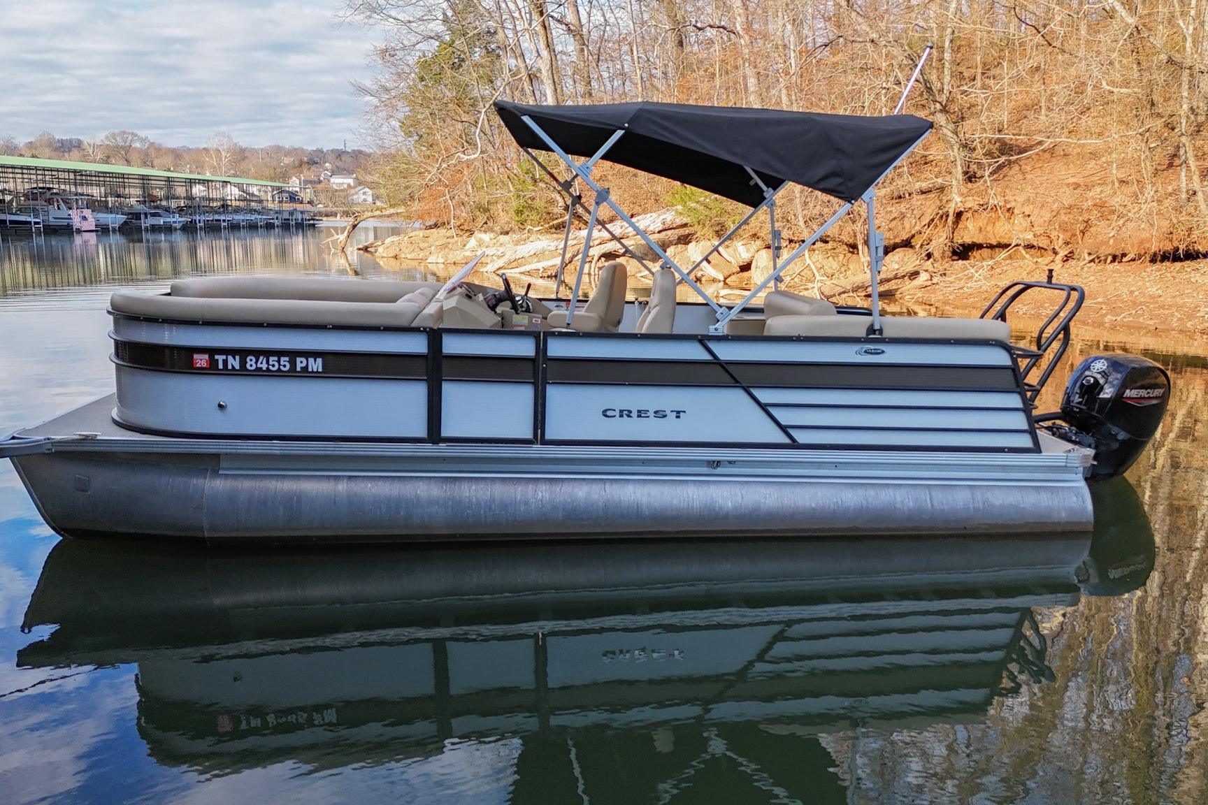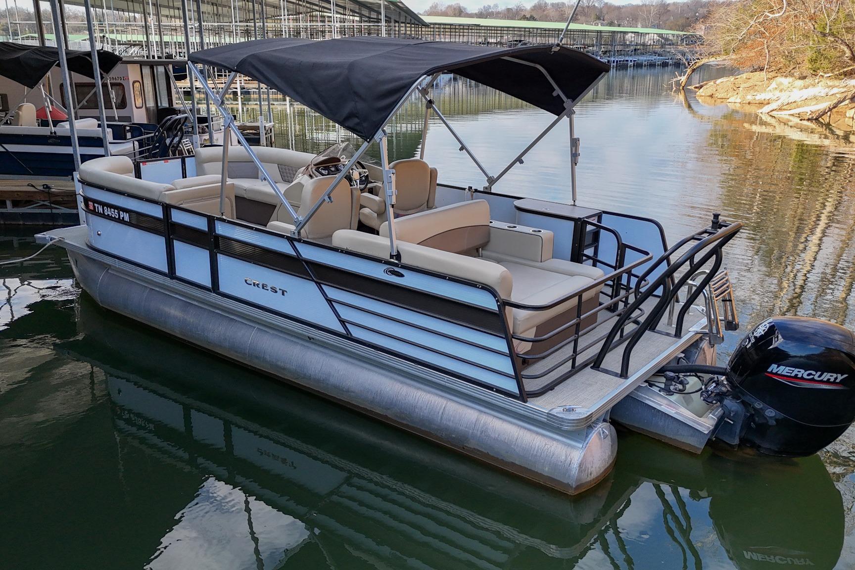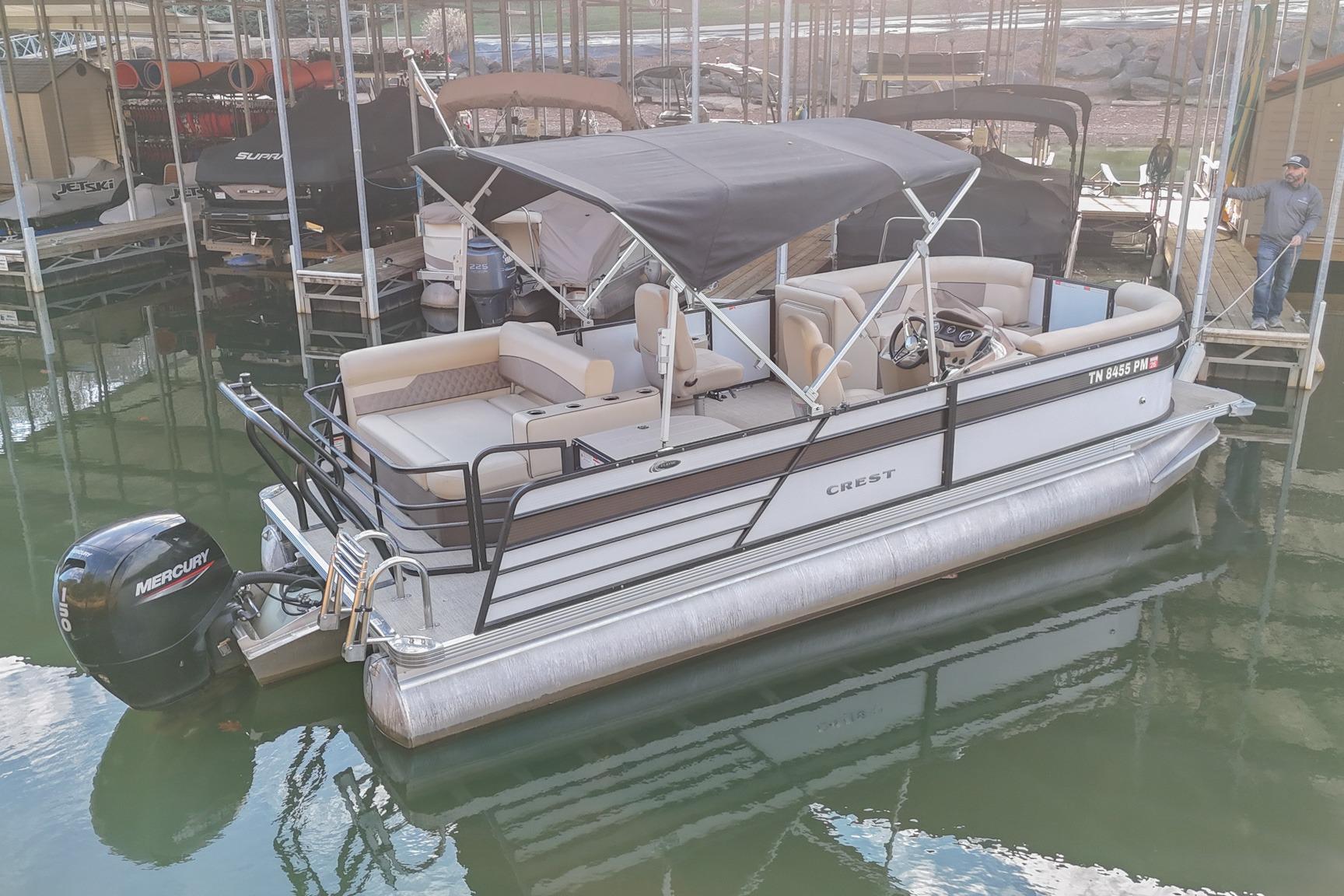 This Crest DLX 220 offers a practical, open pontoon layout designed for comfort and easy movement throughout the boat. The bow features wraparound lounge seating with storage below, creating a relaxed space for passengers while keeping gear out of the way. The aft sunpad features a reversible backrest for a forward/aft facing seating position, while the mid-ship and aft seating areas provide flexible space for cruising or spending time at anchor. An open aft deck and swim ladder make boarding and swimming simple and convenient. Powered by a Mercury 150, it delivers smooth, dependable performance for everyday boating.