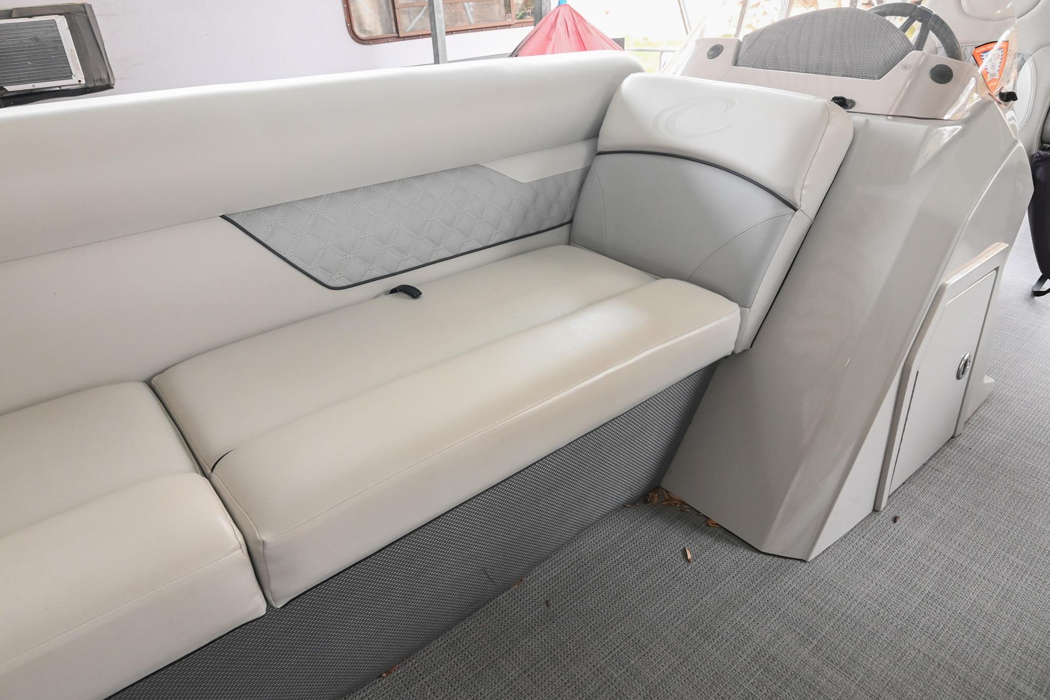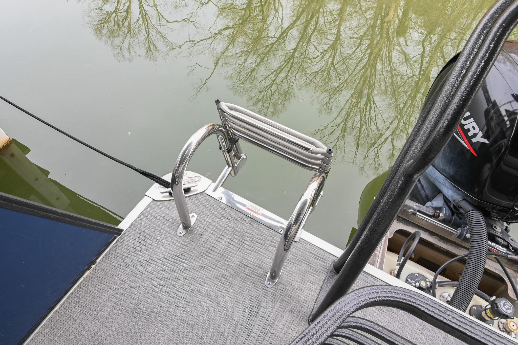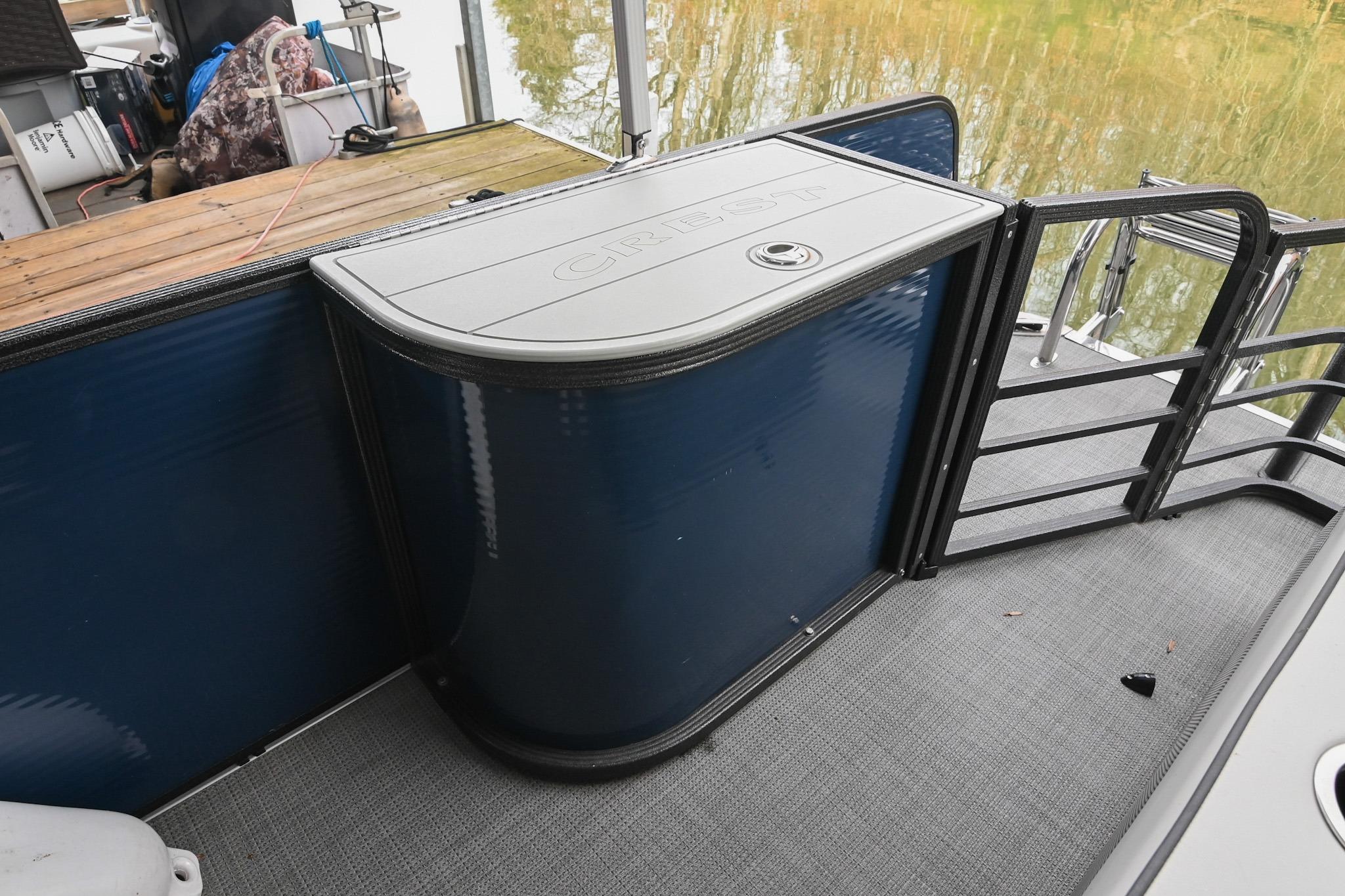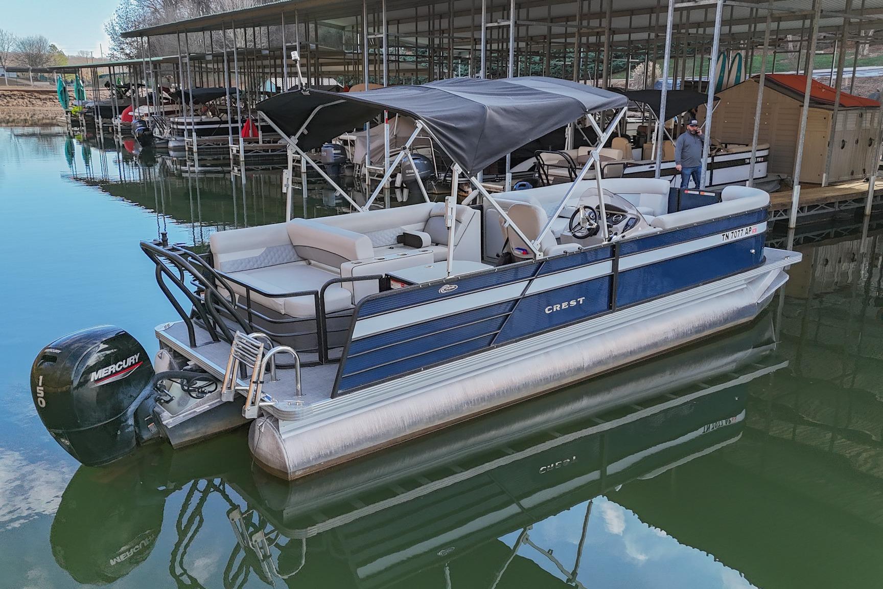 This Crest DLX 220 offers a practical, open pontoon layout designed for comfort and easy movement throughout the boat. The bow features wraparound lounge seating with storage below, creating a relaxed space for passengers while keeping gear out of the way. The aft sunpad features a reversible backrest for a forward/aft facing seating position, while the mid-ship and aft seating areas provide flexible space for cruising or spending time at anchor. An open aft deck and swim ladder make boarding and swimming simple and convenient. Powered by a Mercury 150, it delivers smooth, dependable performance for everyday boating.