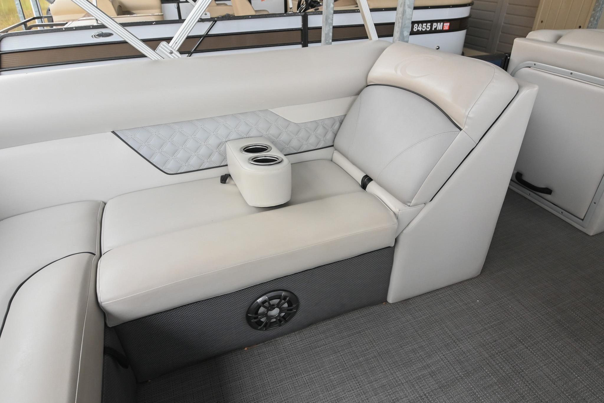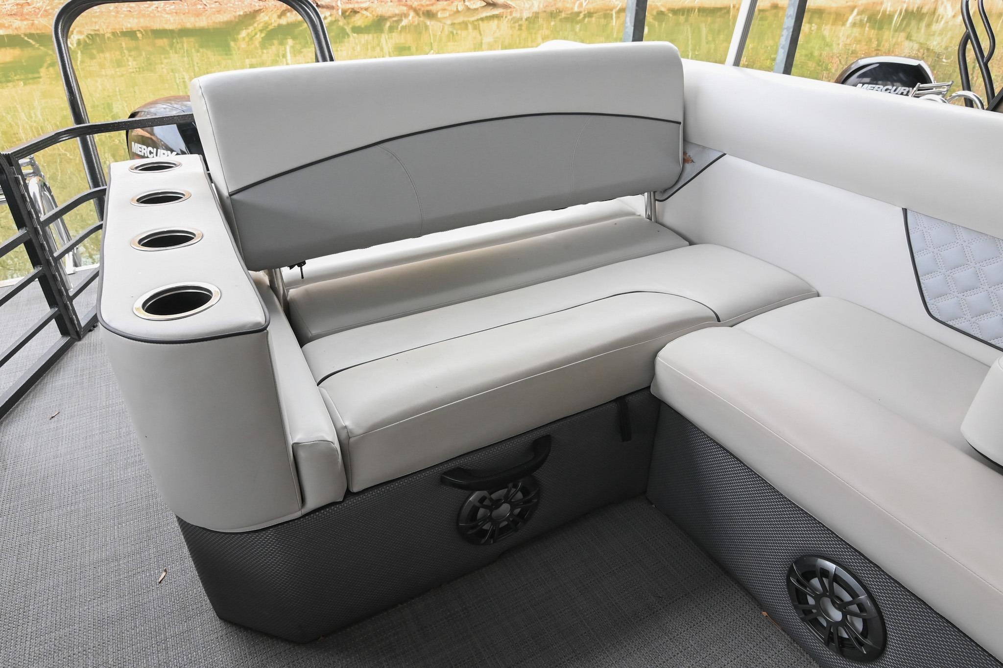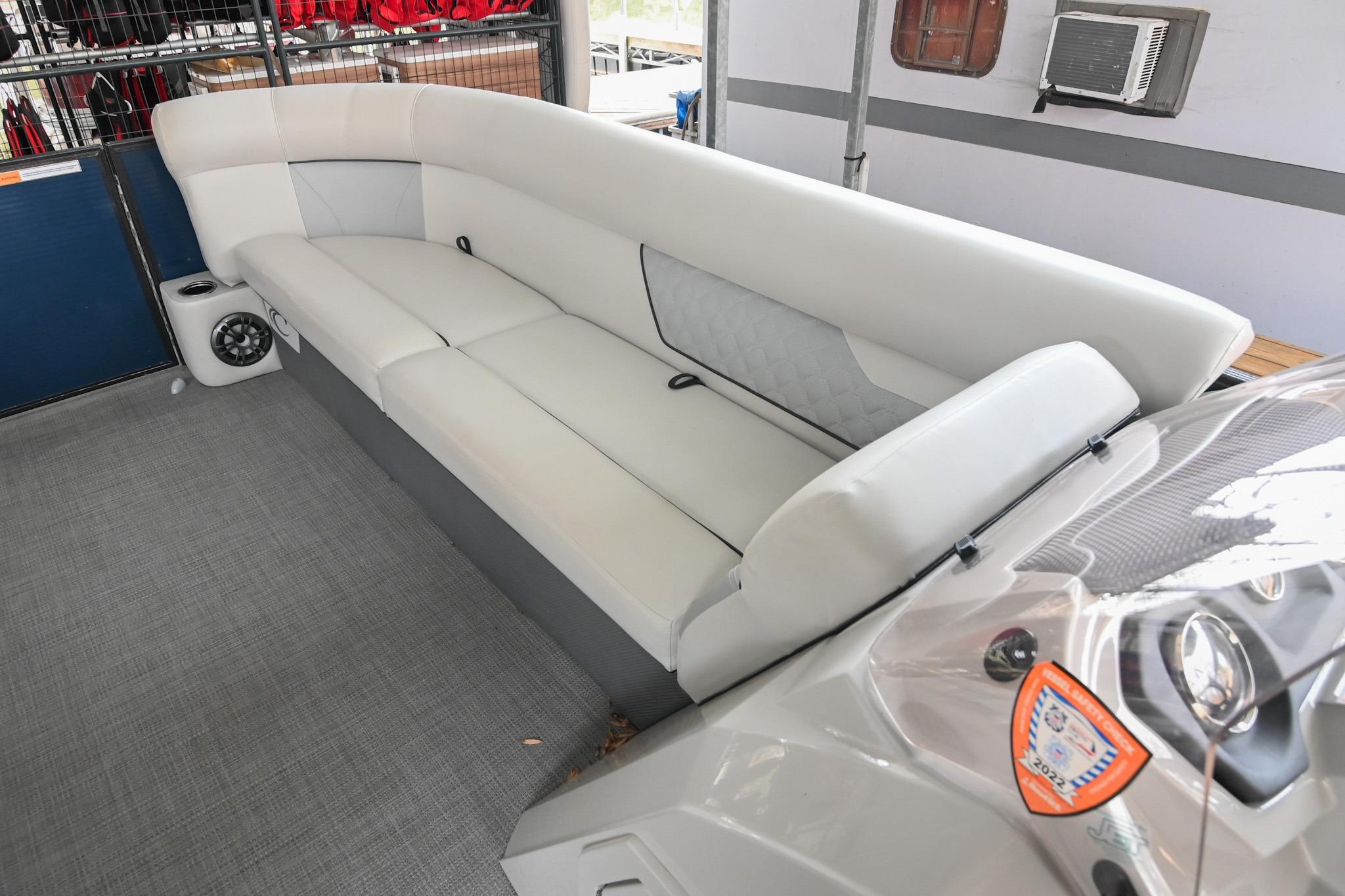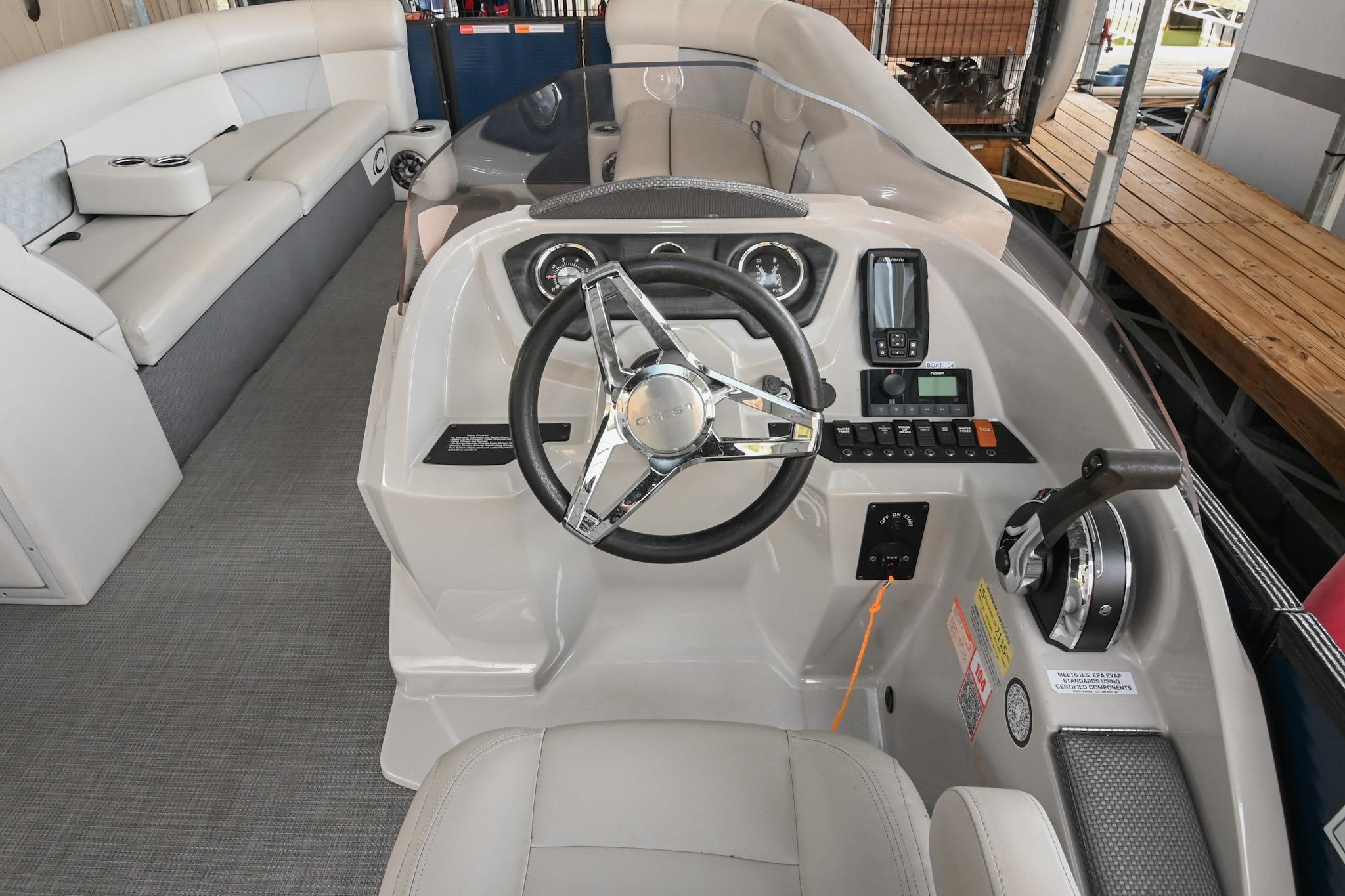 This Crest DLX 220 offers a practical, open pontoon layout designed for comfort and easy movement throughout the boat. The bow features wraparound lounge seating with storage below, creating a relaxed space for passengers while keeping gear out of the way. The aft sunpad features a reversible backrest for a forward/aft facing seating position, while the mid-ship and aft seating areas provide flexible space for cruising or spending time at anchor. An open aft deck and swim ladder make boarding and swimming simple and convenient. Powered by a Mercury 150, it delivers smooth, dependable performance for everyday boating.