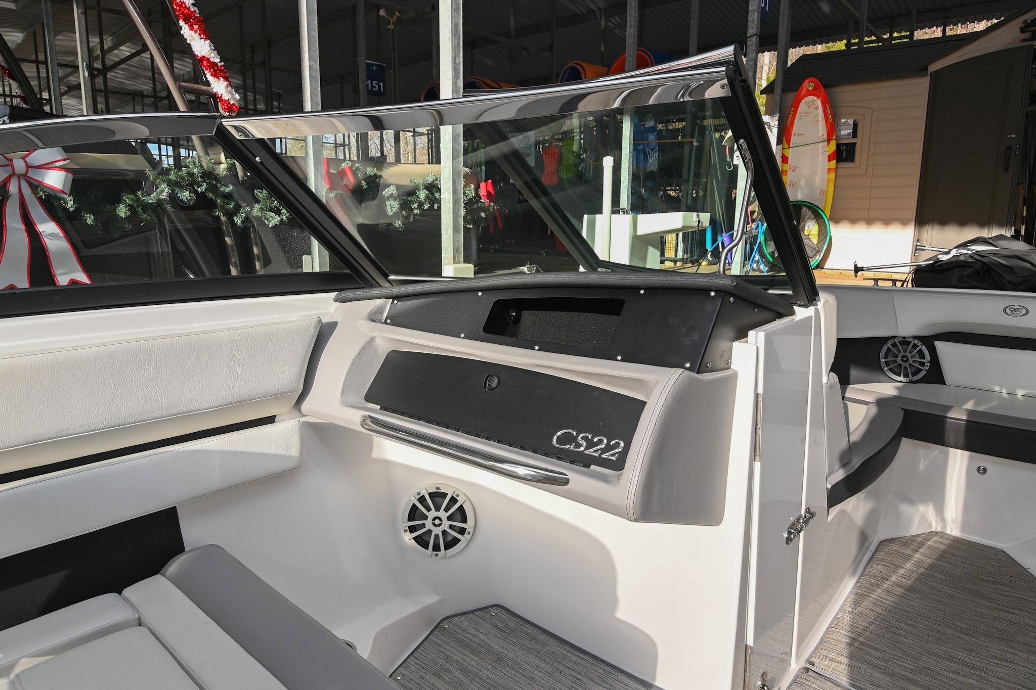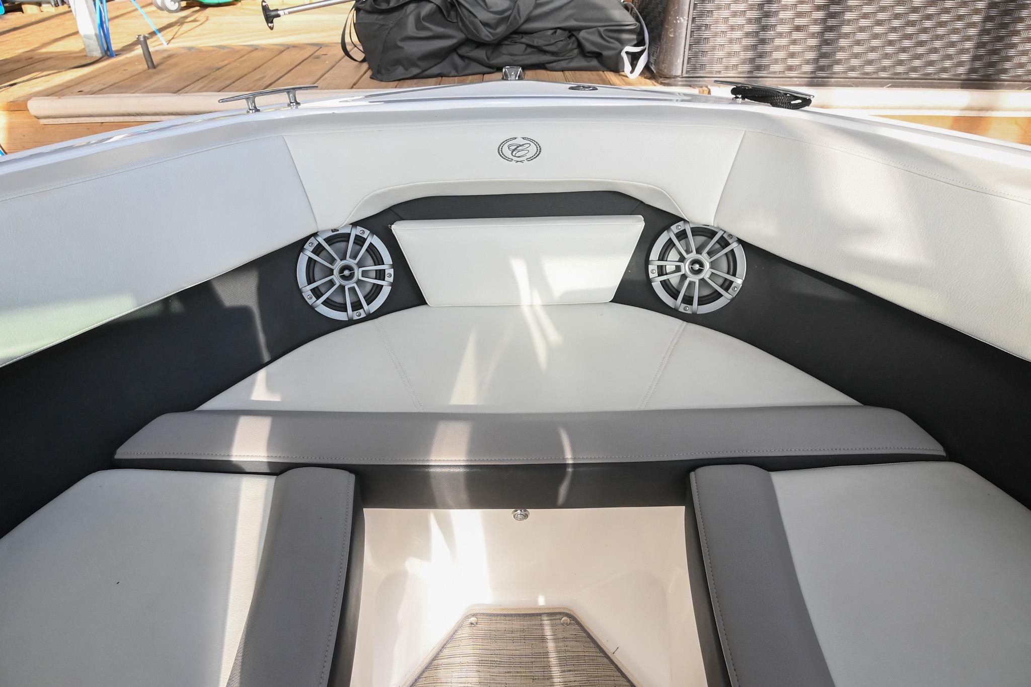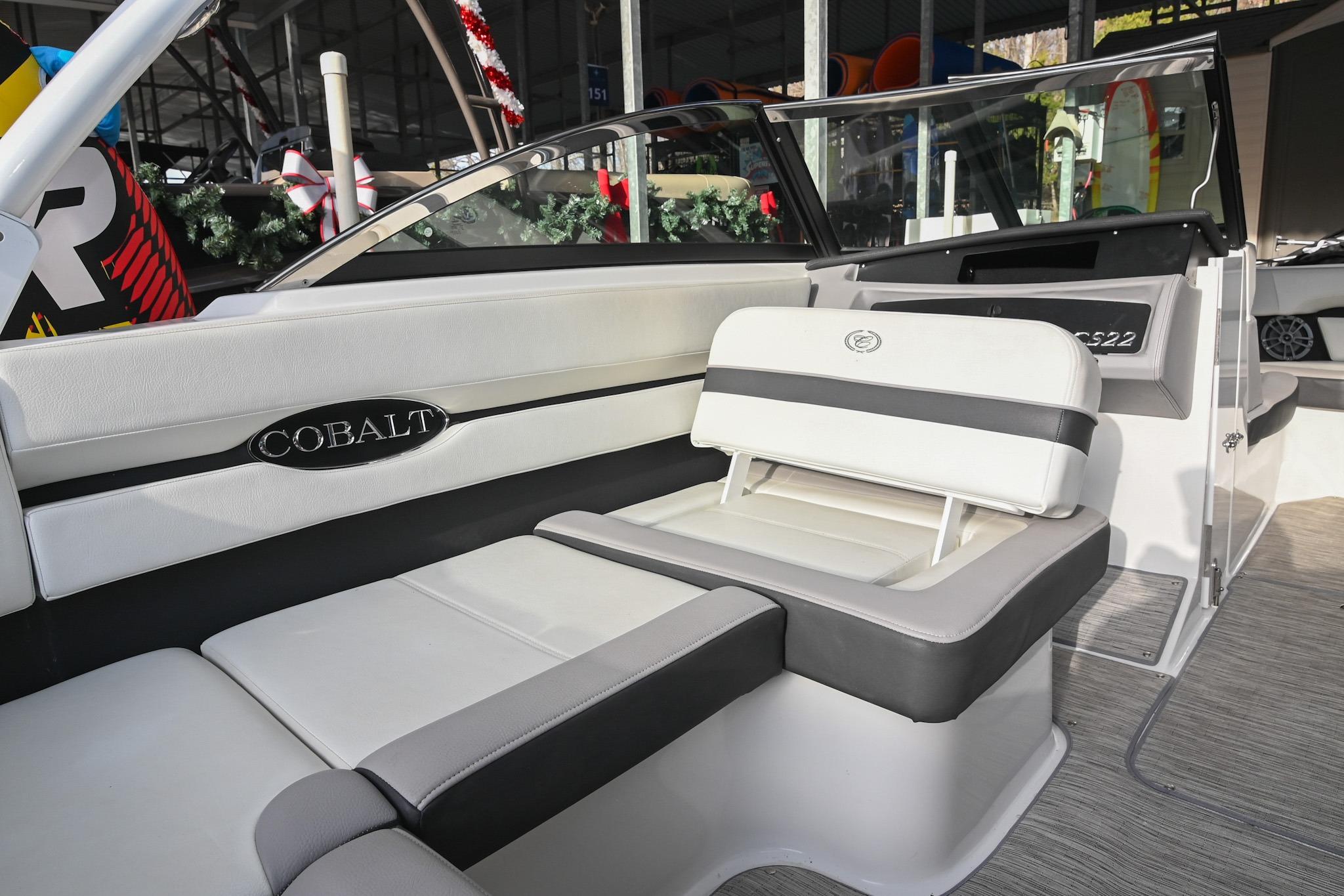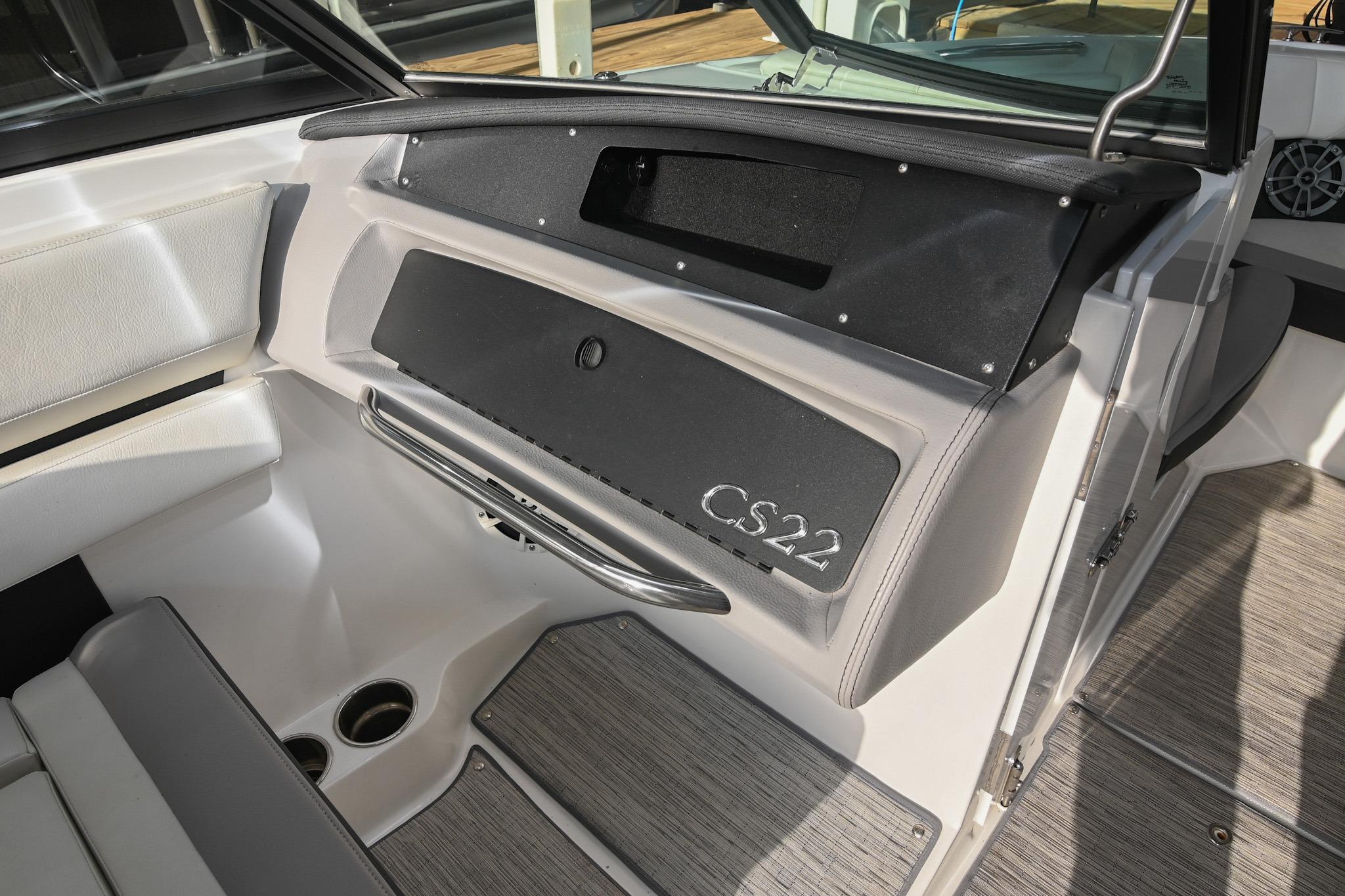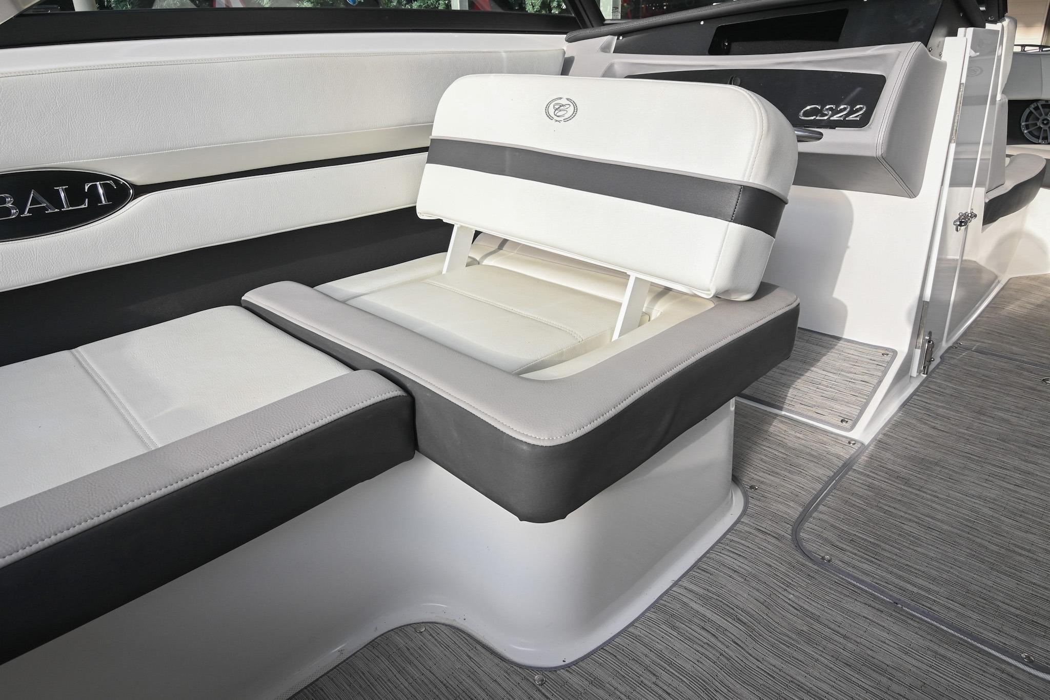 The CS22 is a versatile bowrider that provides an ideal platform to perform a wide array of activities on the water. The ample seating can accommodate eleven passengers, with seating that can be reconfigured, so everyone can be included and seated comfortably while underway. Significant storage is available underseat throughout the boat, as well as a built-in cooler. A folding wakeboard tower not only provides additional clearance for storage but also a tow point for wakeboarders. An additional ski tow eye is located at the transom for additional water sports such as tubing and skiing. This lift-kept CS22 facilitates complete functionality on the water by being able to cruise comfortably, anchor out with comfortable, ample seating, as well as the ability to wakeboard, ski, and tube. All achieved within twenty-two feet through Cobalt's high-end fit and finish and durable hull design.