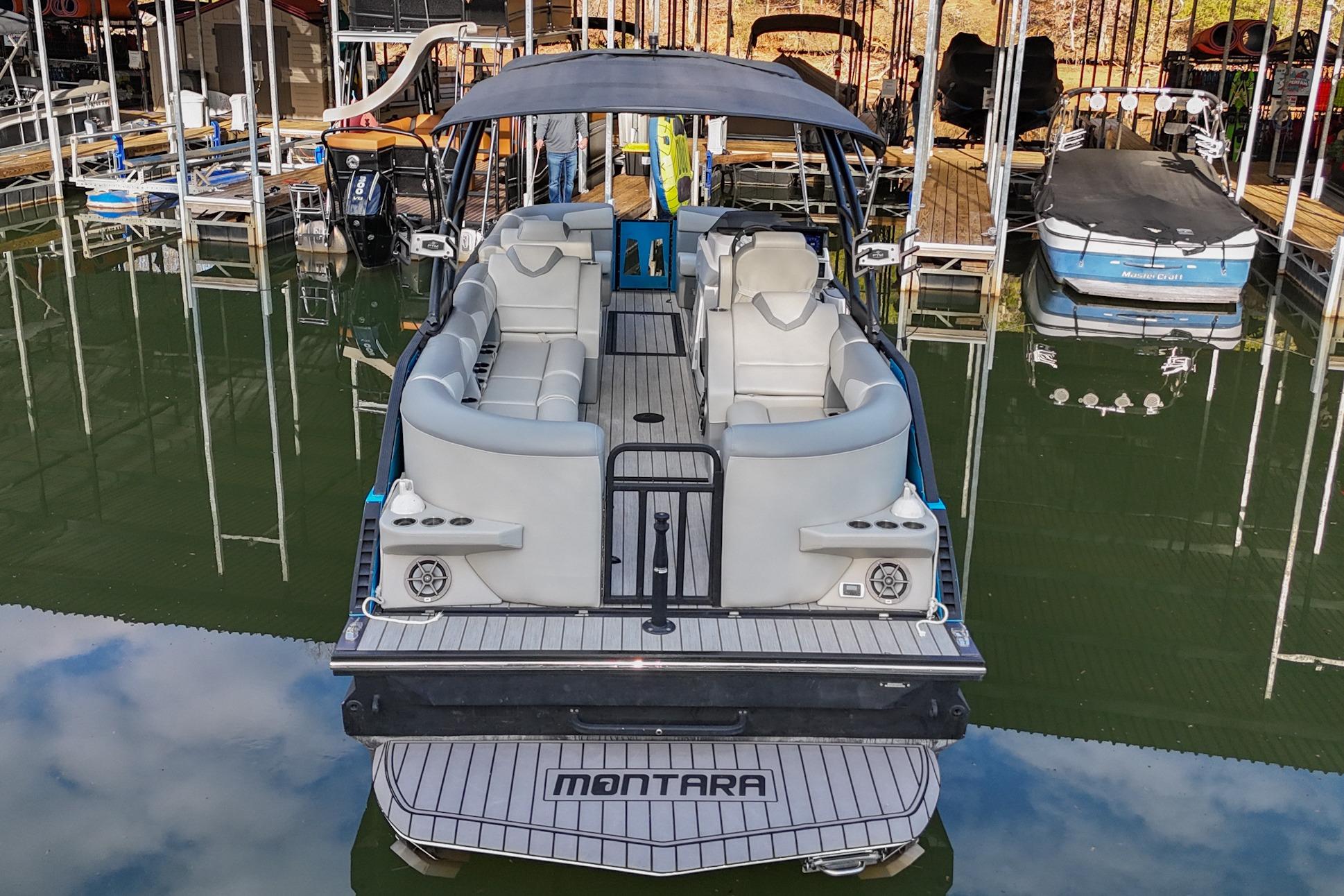 The Montara Surf Boss MT 2.0 is built on a purpose-designed pontoon platform that integrates the pontoon layout with surf capability. The elevated deck layout keeps the cockpit open and social while allowing the stern to sit lower in the water, which is key to creating a surfable wave. The integrated surf system uses ballast and hull design to generate a clean, consistent, wave behind the boat. A spacious pontoon seating configuration is arranged to maintain easy movement throughout the boat. The Montara achieves the comfortable seating aspect of a modern pontoon while simultaneously delivering surf capability.
